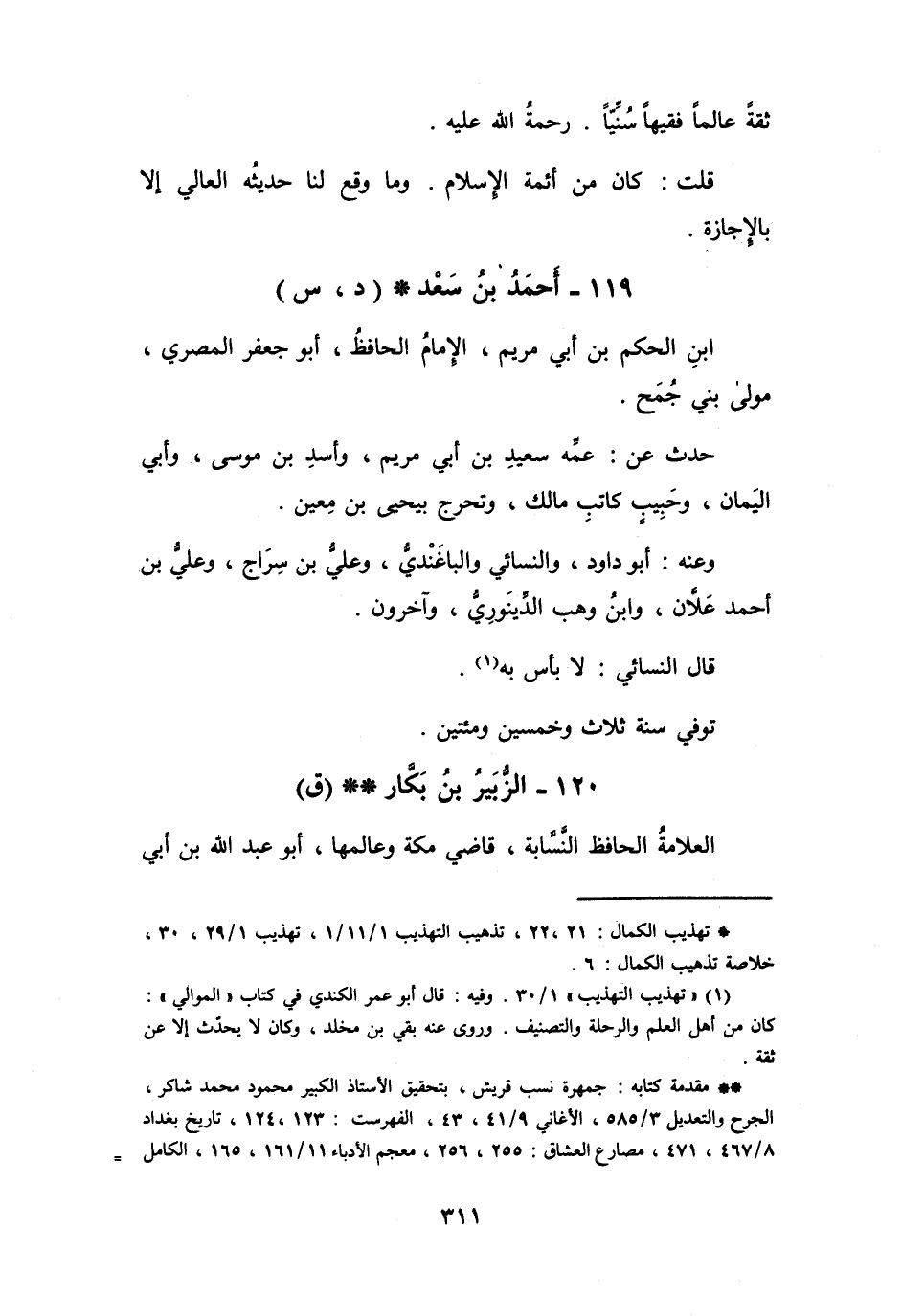 (* *) مقدمة كتابه: جمهرة نسب قريش، بتحقيق الأستاذ الكبير محمود محمد شاكر، الجرح والتعديل 3 / 585، الاغاني 9 / 41، 43، الفهرست: 123، 124، تاريخ بغداد 8 / 467، 471، مصارع العشاق: 255، 256، معجم الأدباء 11 / 161، 165، الكامل =