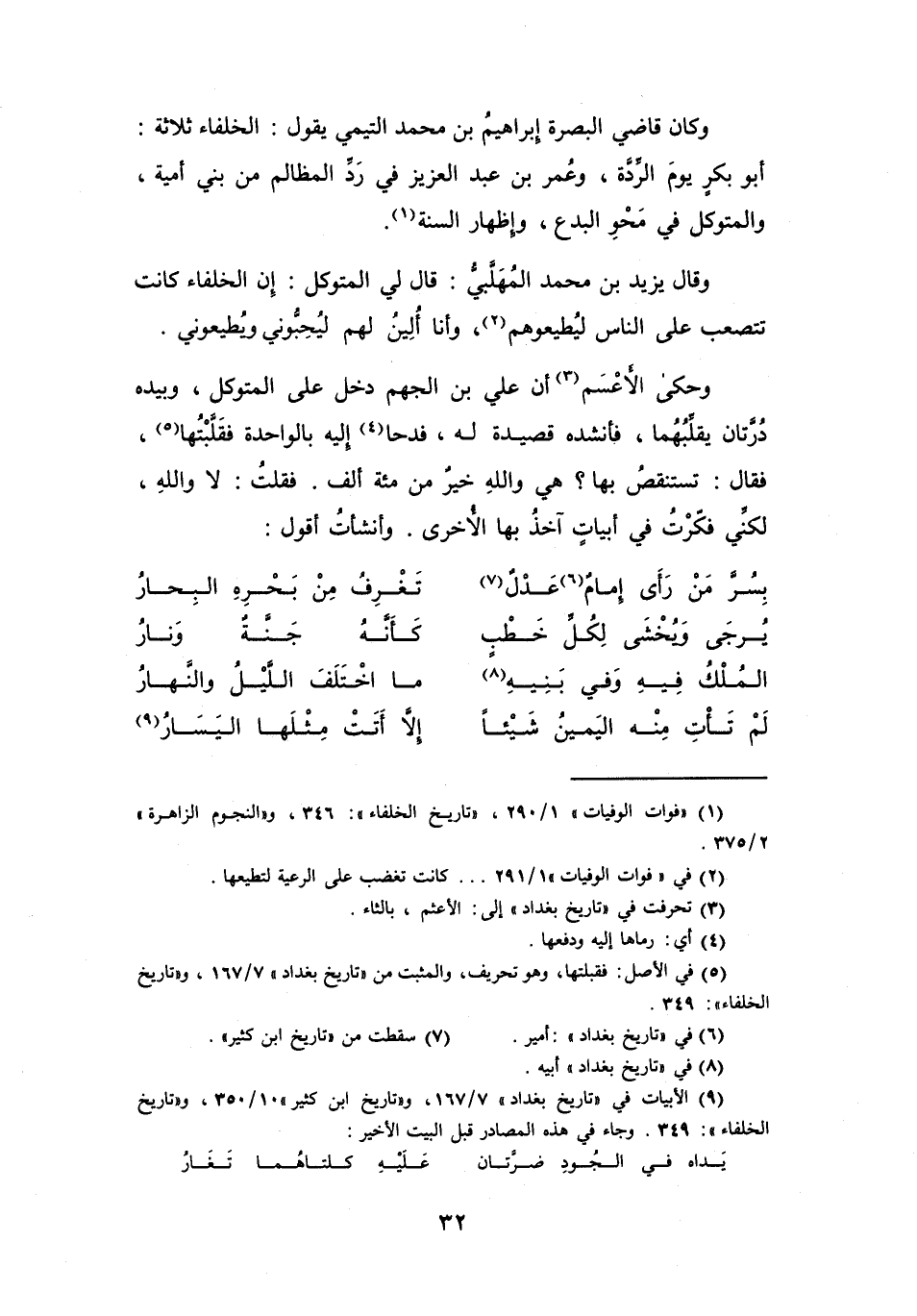 (9) الابيات في " تاريخ بغداد " 7 / 167، و" تاريخ ابن كثير " 10 / 350، و" تاريخ الخلفاء ": 349.