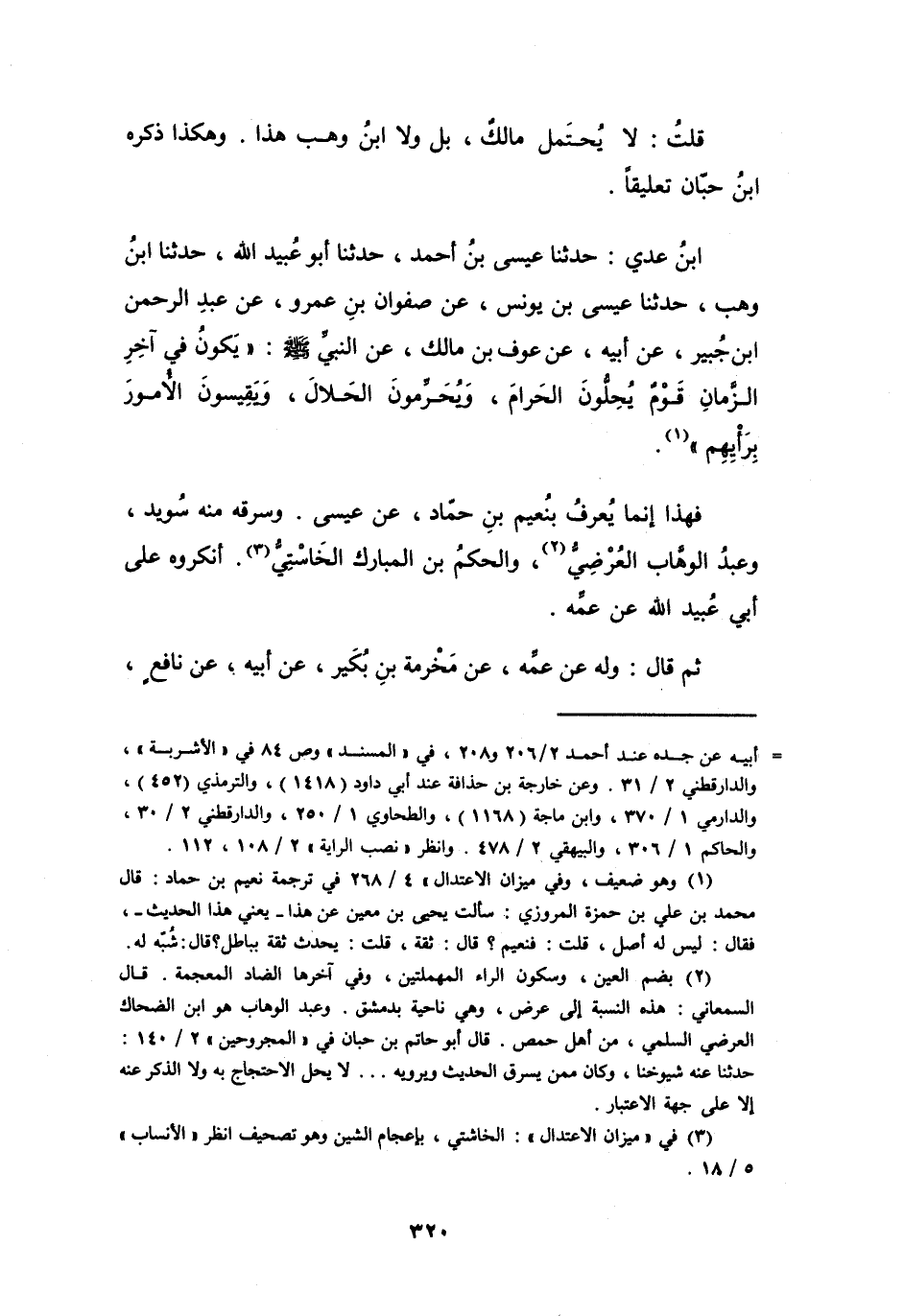 فهَذَا إِنَّمَا يُعْرَفُ بِنُعَيْمِ بنِ حَمَّادٍ، عَنْ عِيْسَى، وَسرقَهُ مِنْهُ سُوَيْدٌ، وَعَبْدُ الوَهَّابِ العُرْضِيُّ (2) ، وَالحَكَمُ بنُ المُبَارَكِ الخَاسْتِيُّ (3) ، أَنْكَروهُ عَلَى أَبِي عبيدِ اللهِ عَنْ عَمِّهِ.