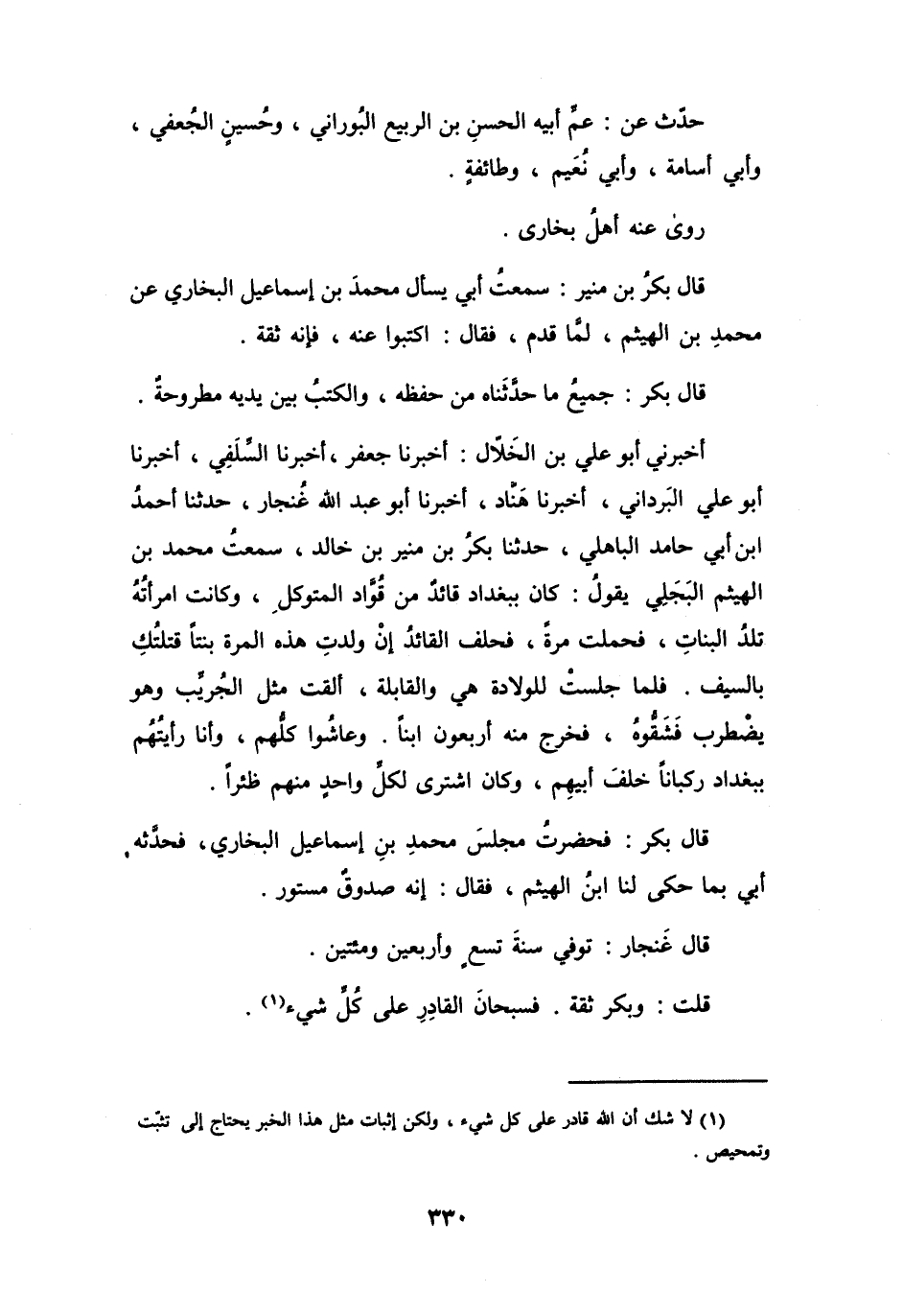 قَالَ بكرٌ: فَحضرتُ مَجْلِسَ مُحَمَّدِ بنِ إِسْمَاعِيْلَ البُخَارِيِّ، فَحَدَّثَهُ أَبِي بِمَا حَكَى لَنَا ابْنُ الهَيْثَمِ، فَقَالَ: إِنَّهُ صَدُوْقٌ مستورٌ.