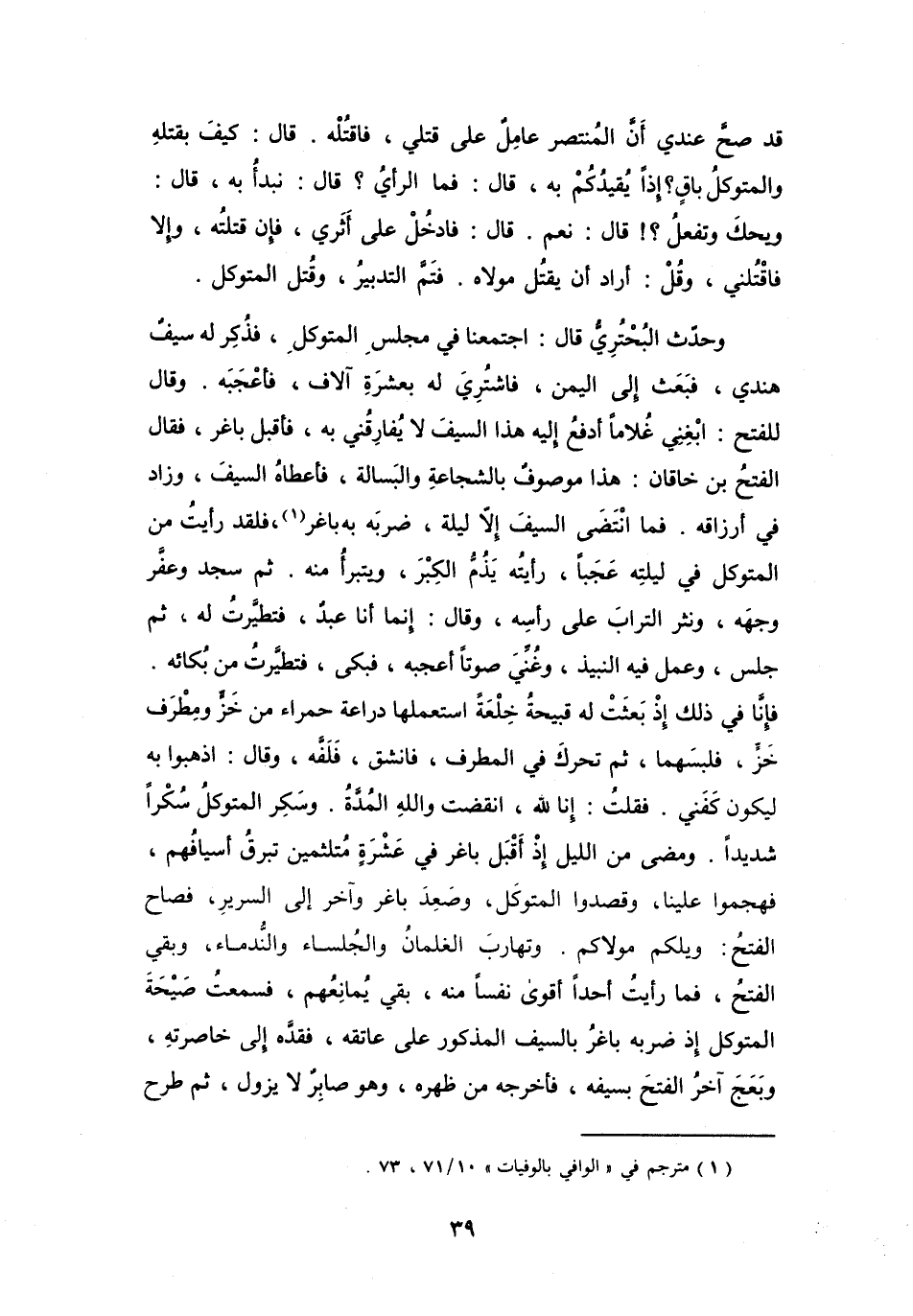 وَتَهَارَبَ الغِلْمَانُ وَالجُلَسَاءُ وَالنُّدَمَاءُ، وَبَقِيَ الفَتْحُ، فَمَا رَأَيْتُ أَحَداً أَقْوَى نَفساً مِنْهُ، بَقِيَ يُمَانِعُهُم، فَسَمِعْتُ صَيْحَةَ المُتَوَكِّلِ إِذْ ضَرَبَهُ بَاغِرُ بِالسَّيْفِ المَذْكُوْرِ عَلَى عَاتِقِهِ، فَقَدَّهُ إِلَى خَاصِرَتِهِ، وَبَعَجَ آخَرُ الفَتْحَ بِسَيْفِهِ، فَأَخْرَجَهُ مِنْ ظَهْرِهِ، وَهُوَ صَابِرٌ لاَ يَزُوْلُ، ثُمَّ طَرَحَ