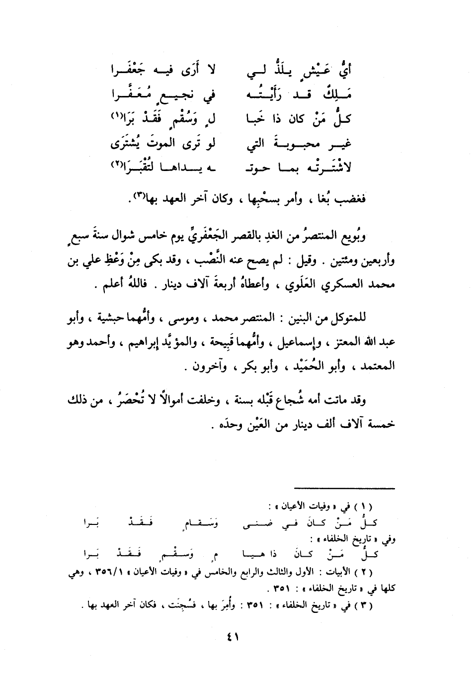 (2) الابيات: الأول والثالث والرابع والخامس في " وفيات الأعيان " 1 / 356، وهي كلها في " تاريخ الخلفاء ": 351.