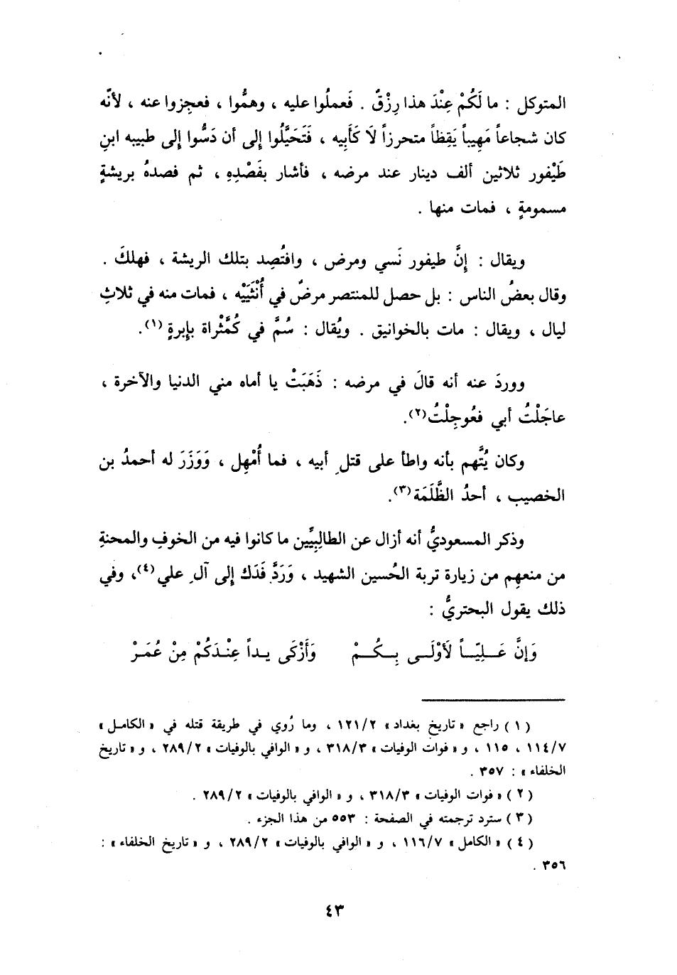 (4) " الكامل " 7 / 116، و" الوافي بالوفيات " 2 / 289، و" تاريخ الخلفاء ": 356.