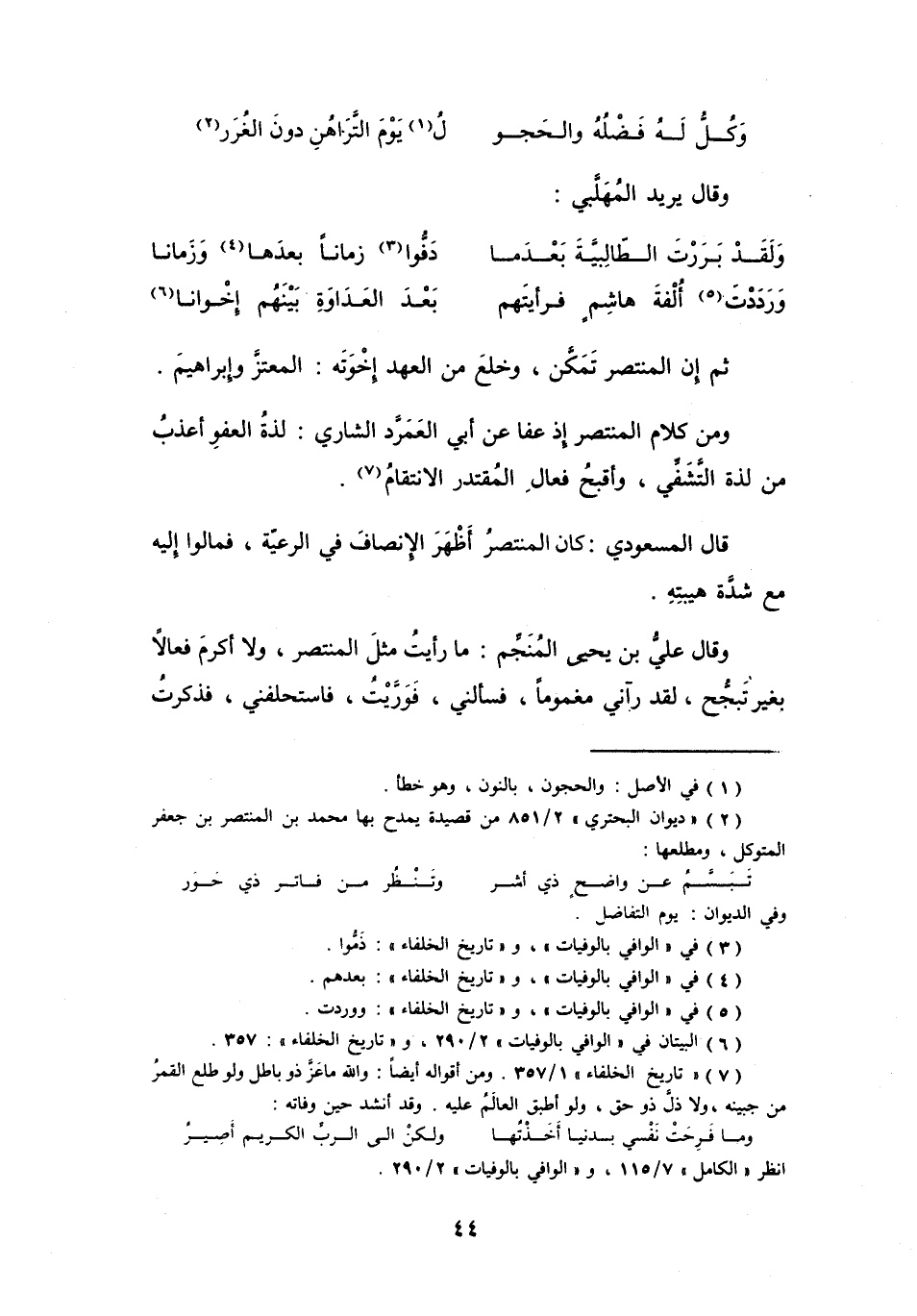 (2) " ديوان البحتري " 2 / 851 من قصيدة يمدح بها محمد بن المنتصر بن جعفر المتوكل، ومطلعها: تبسم عن واضح ذي أشر * وتنظر من فاتر ذي حور وفي الديوان: يوم التفاضل.