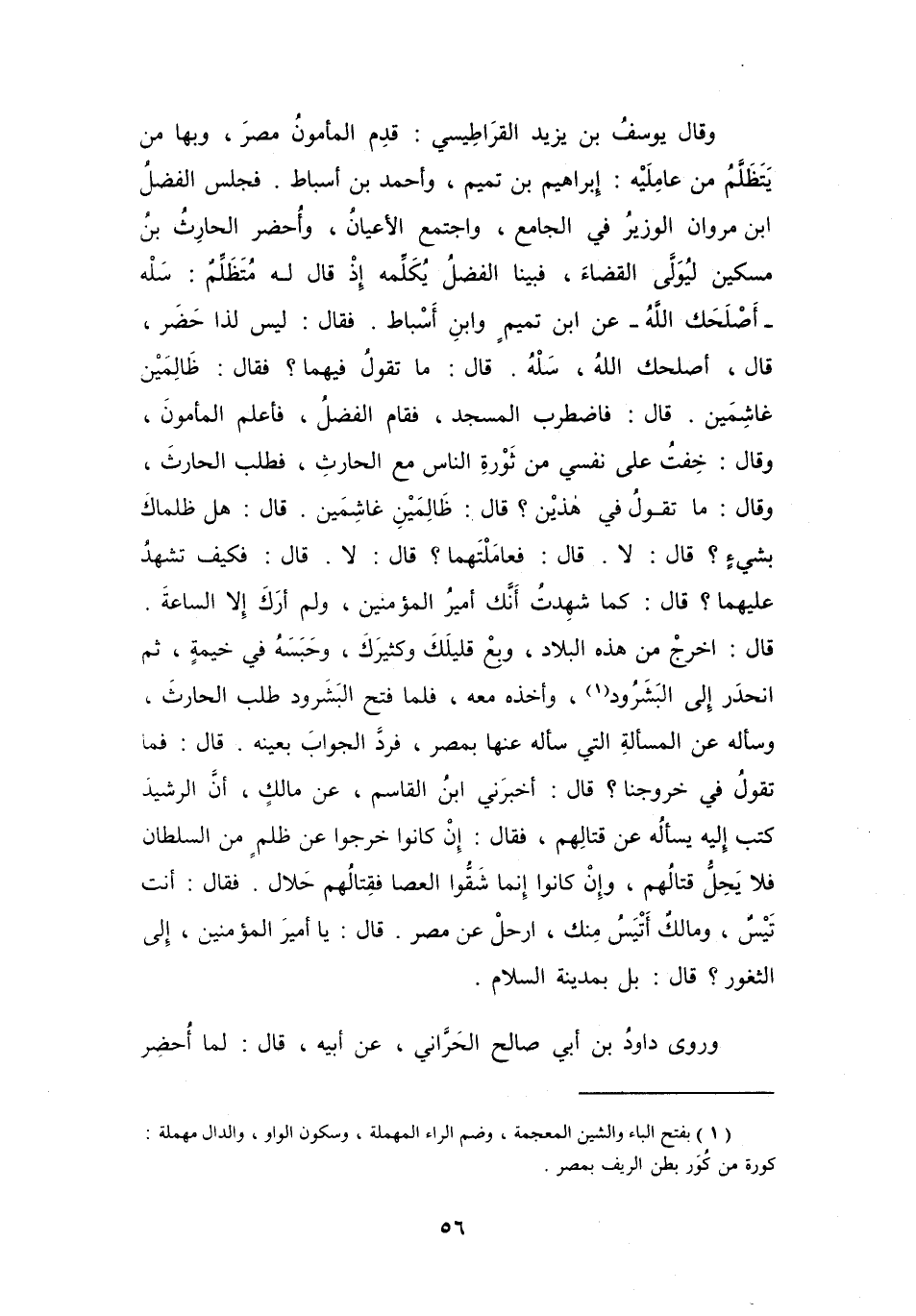 وَقَالَ يُوْسُفُ بنُ يَزِيْدَ القَرَاطِيْسِيُّ: قَدِمَ المَأْمُوْنُ مِصْرَ، وَبِهَا مَنْ يَتَظَلَّمُ مِنْ عَامِلَيْهِ: إِبْرَاهِيْمَ بنِ تَمِيْمٍ، وَأَحْمَدَ بنِ أَسْبَاطٍ.