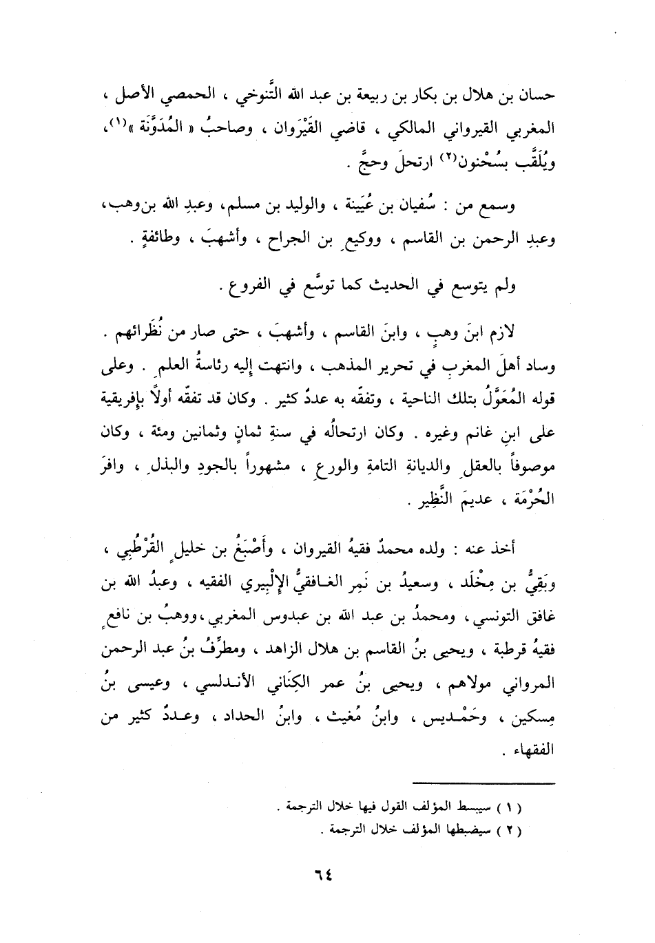 حَسَّانَ بنِ هِلاَلِ بنِ بَكَّارِ بنِ رَبِيْعَةَ بنِ عَبْدِ اللهِ التَّنُوْخِيُّ، الحِمْصِيُّ الأَصْلِ، المَغْرِبِيُّ، القَيْرَوَانِيُّ، المَالِكِيُّ، قَاضِي القَيْرَوَانِ، وَصَاحِبُ (المُدَوَّنَةِ (1)) ، وَيُلَقَّبُ: بِسَحْنُوْنَ (2) ، ارْتَحَلَ وَحَجَّ.