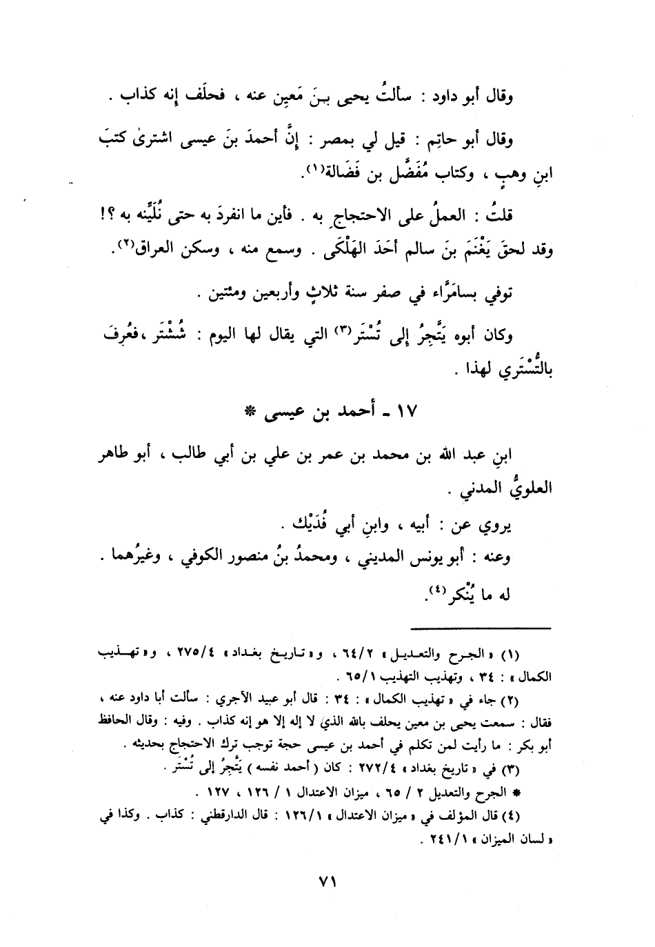 (2) جاء في " تهذيب الكمال ": 34: قال أبو عبيد الآجري: سألت أبا داود عنه، فقال: سمعت يحيى بن معين يحلف بالله الذي لا إله إلا هو إنه كذب. وفيه: وقال الحافظ أبو بكر: ما رأيت لمن تكلم في أحمد بن عيسى حجة توجب ترك الاحتجاج بحديثه.