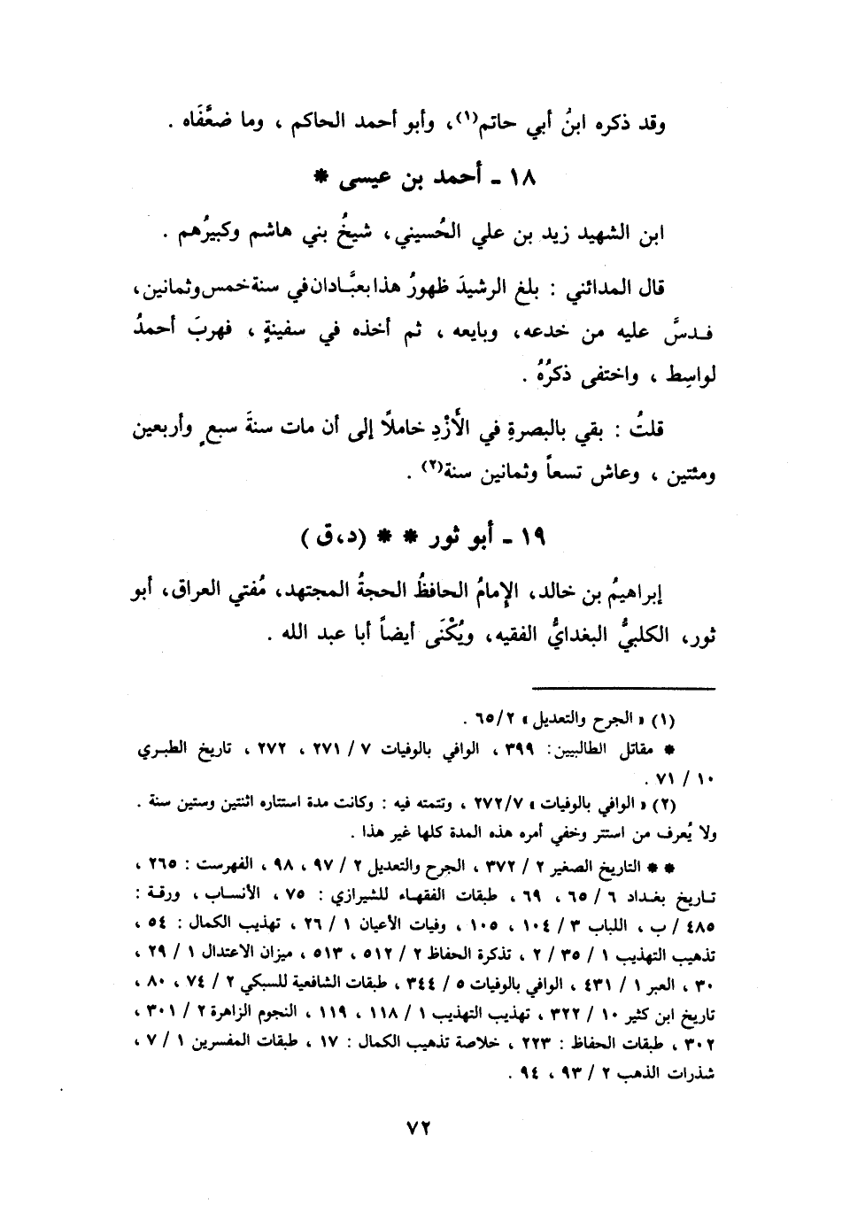 (* *) التاريخ الصغير 2 / 372، الجرح والتعديل 2 / 97، 98، الفهرست: 265، تاريخ بغداد 6 / 65، 69، طبقات الفقهاء للشيرازي: 75، الأنساب، ورقة: 485 / ب، اللباب 3 / 104، 105، وفيات الأعيان 1 / 26، تهذيب الكمال: 54، تذهيب التهذيب 1 / 35 / 2، تذكرة الحفاظ 2 / 512، 513، ميزان الاعتدال 1 / 29، 30، العبر 1 / 431، الوافي بالوفيات 5 / 344، طبقات الشافعية للسبكي 2 / 74، 80، تاريخ ابن كثير 10 / 322، تهذيب التهذيب 1 / 118، 119، النجوم الزاهرة 2 / 301، 302، طبقات الحفاظ: 223، خلاصة تذهيب الكمال: 17، طبقات المفسرين 1 / 7، شذرات الذهب 2 / 93، 94.