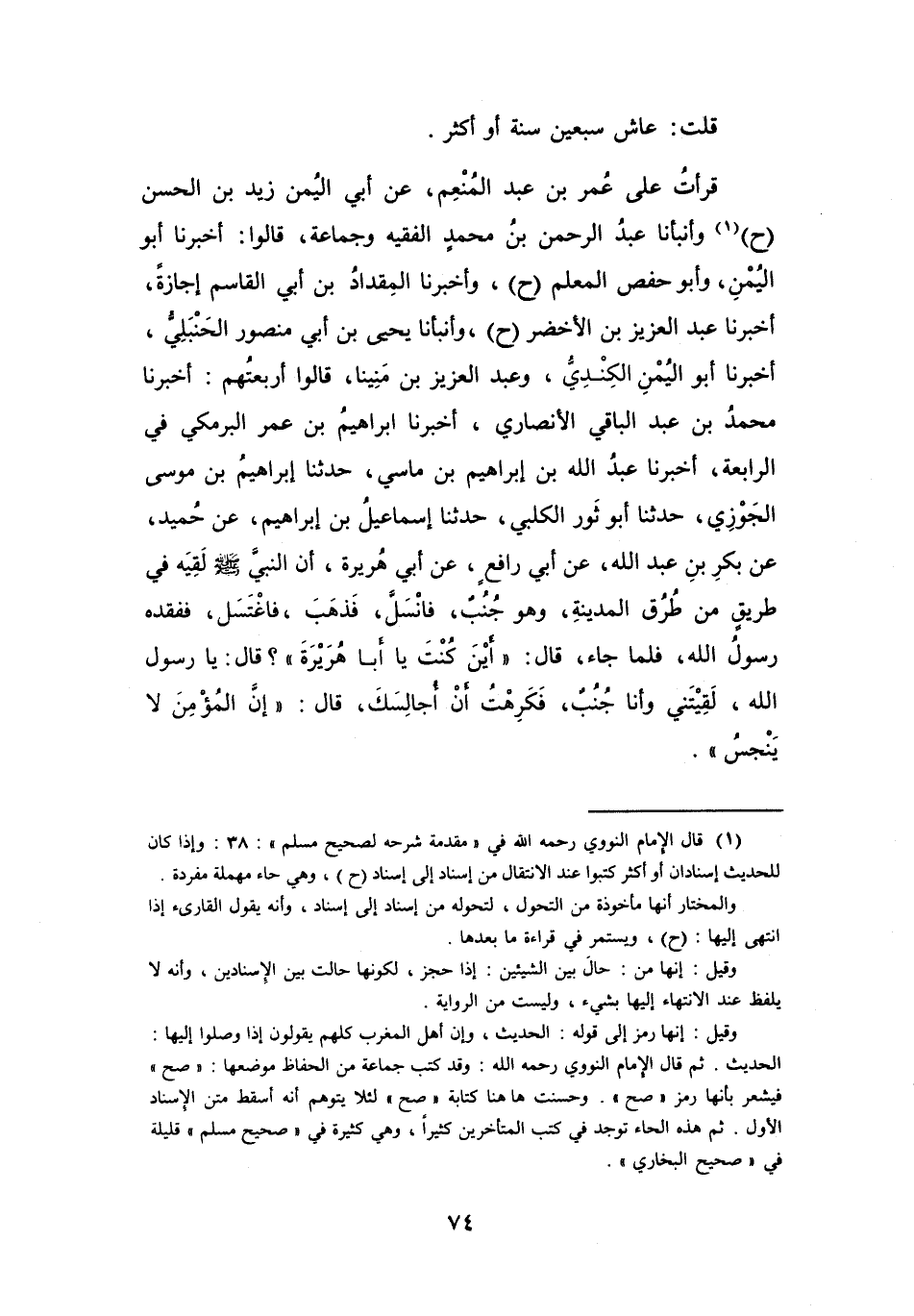 (1) قال الامام النووي رحمه الله في " مقدمة شرحه لصحيح مسلم ": 38: وإذا كان للحديث إسنادان أو أكثر كتبوا عند الانتقال من إسناد إلى إسناد (ح) ، وهي حاء مهملة مفردة.