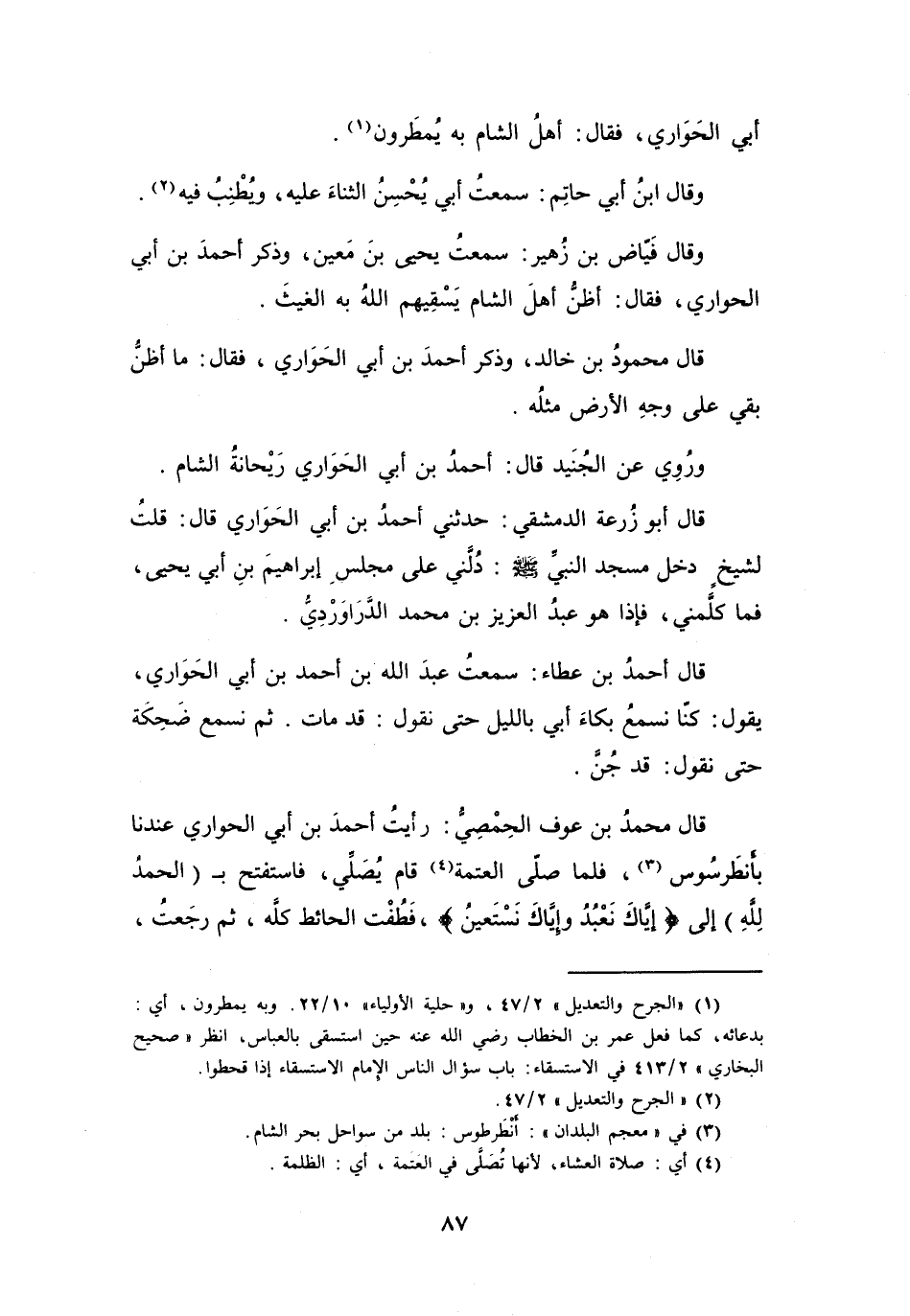 قَالَ مُحَمَّدُ بنُ عَوْفٍ الحِمْصِيُّ: رَأَيْتُ أَحْمَدَ بنَ أَبِي الحَوَارِيِّ عِنْدَنَا بِأَنْطَرْسُوْسَ (3) ، فَلَمَّا صَلَّى العَتَمَةَ (4) ، قَامَ يُصَلِّي، فَاسْتَفْتَحَ بِـ {الحَمْدُ للهِ} إِلَى {إِيَّاكَ نَعْبُدُ وَإِيَّاكَ نَسْتَعِيْنُ} ، فَطُفْتُ الحَائِطَ كُلَّهُ، ثُمَّ رَجَعْتُ،