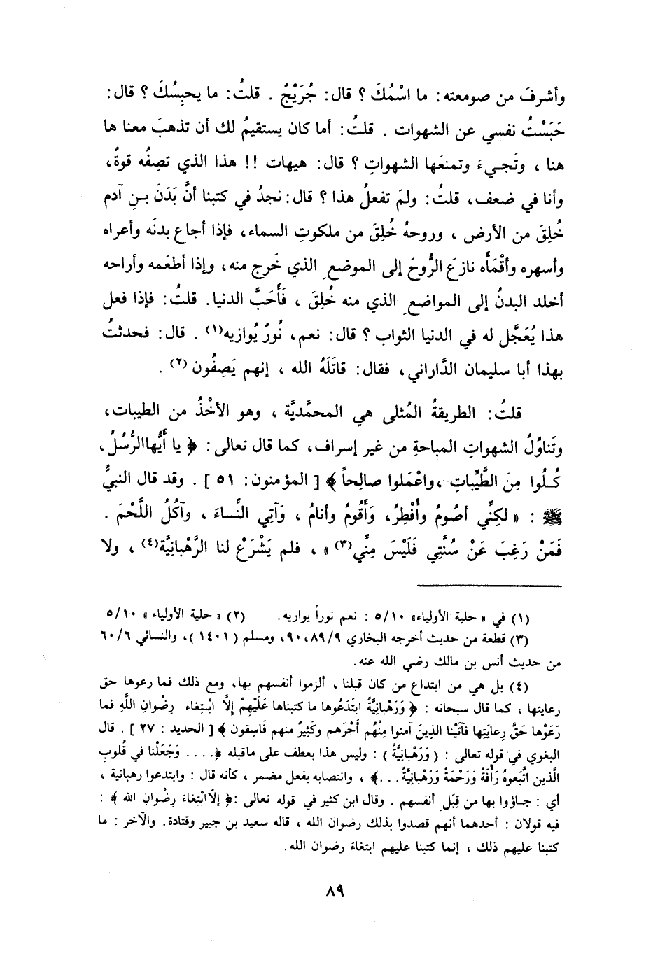قُلْتُ: الطَّرِيْقَةُ المُثْلَى هِيَ المُحَمَّدِيَّةُ، وَهُوَ الأَخْذُ مِنَ الطَّيِّبَاتِ، وَتَنَاوُلُ الشَّهَوَاتِ المُبَاحَةِ مِنْ غَيْرِ إِسْرَافٍ، كَمَا قَالَ -تَعَالَى -: {يَا أَيُّهَا الرُّسُلُ، كُلُوا مِنَ الطَّيِّبَاتِ وَاعْمَلُوا صَالِحاً} [المُؤْمِنُوْنَ: 51] .