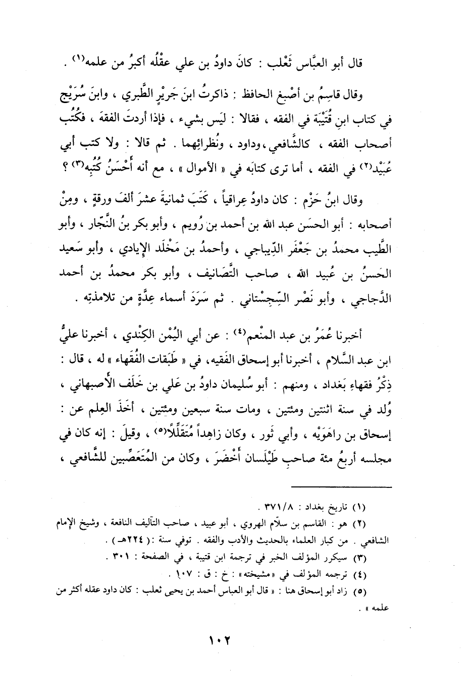 ذِكْرُ فُقَهَاءِ بَغْدَادَ: وَمِنْهُم: أَبُو سُلَيْمَانَ دَاودُ بنُ عَلِيِّ بنِ خَلَفٍ الأَصْبَهَانِيُّ، وُلِدَ فِي سَنَةِ اثْنَتَيْنِ وَمائَتَيْنِ، وَمَاتَ سَنَةَ سَبْعِيْنَ وَمائَتَيْنِ، أَخَذَ العِلْمَ عَنْ: إِسْحَاقَ بنِ رَاهْوَيْه، وَأَبِي ثَوْرٍ، وَكَانَ زَاهِداً مُتَقَلِّلاً (5) ، وَقِيْلَ: إِنَّهُ كَانَ فِي مَجْلِسِهِ أَرْبَعُ مائَةِ صَاحِبِ طَيْلَسَانَ أَخْضَرَ، وَكَانَ مِنَ المُتَعَصِّبِيْنَ لِلشَّافِعِي،