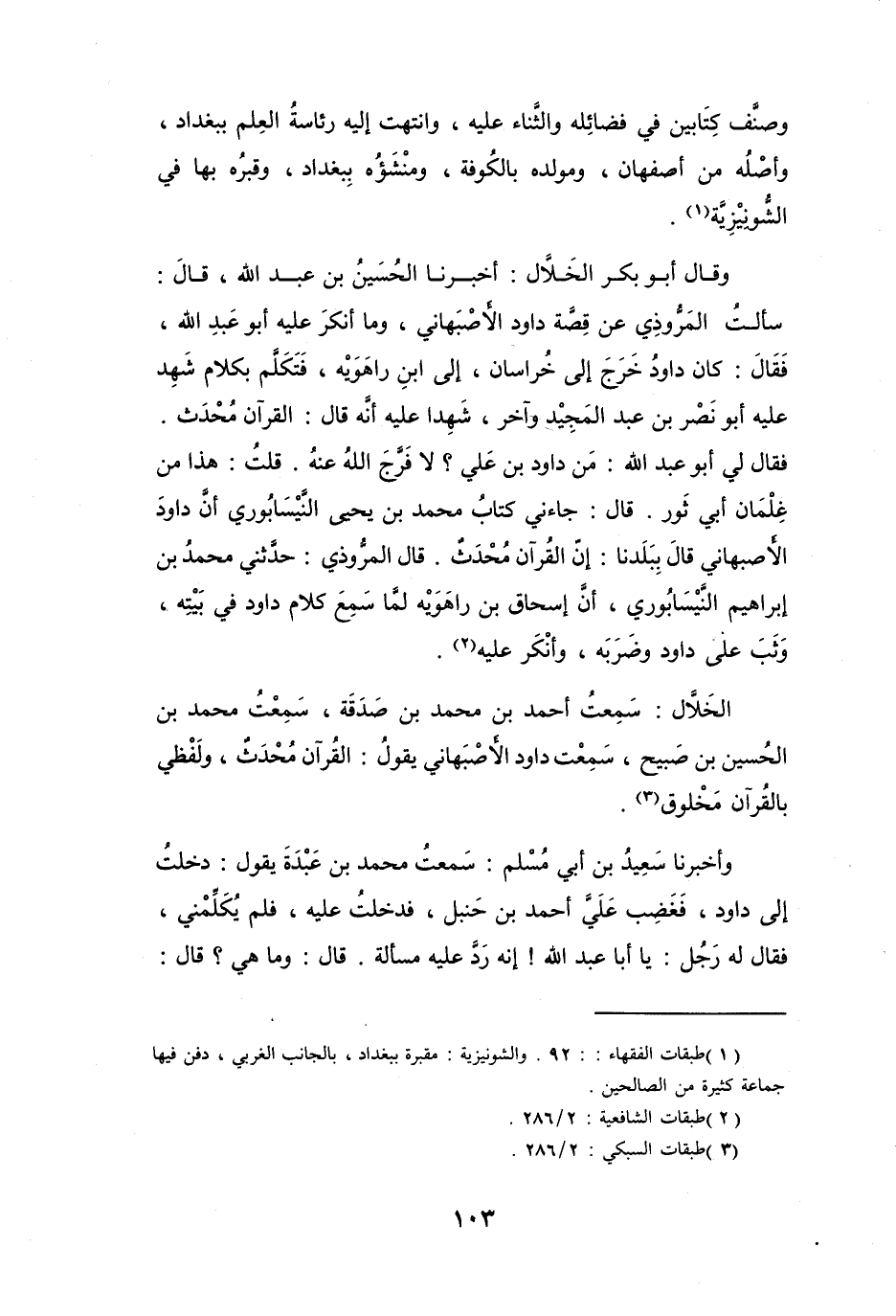 الخَلاَّلُ: سَمِعْتُ أَحْمَدَ بنَ مُحَمَّدِ بنِ صَدَقَةَ، سَمِعْتُ مُحَمَّدَ بنَ الحُسَيْنِ بنِ صَبِيْحٍ، سَمِعْتُ دَاوُدَ الأَصْبَهَانِيَّ يَقُوْلُ: