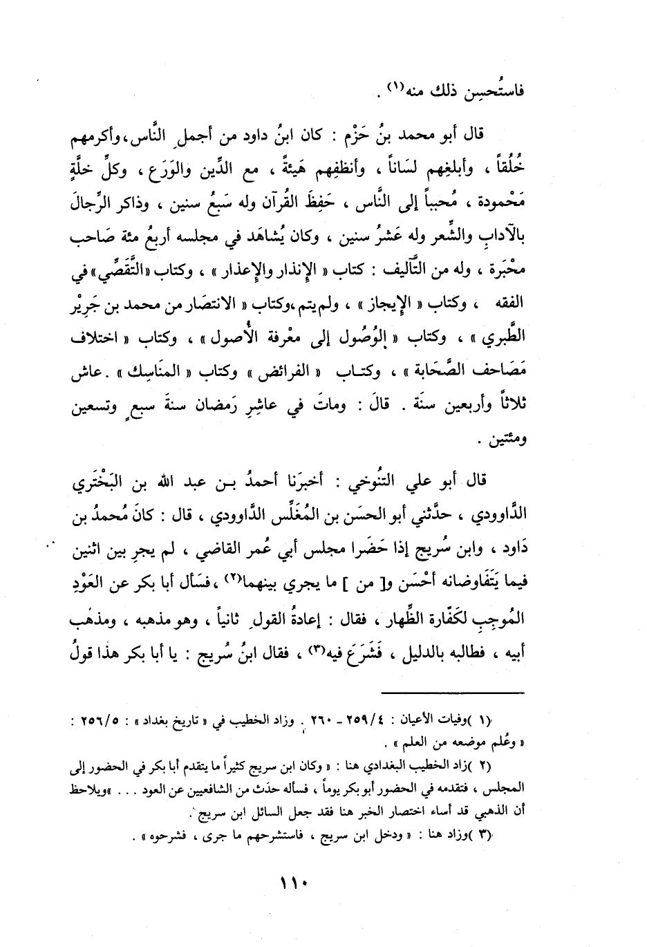 (2) زاد الخطيب البغدادي هنا: " وكان ابن سريج كثيرا ما يتقدم أبا بكر في الحضور إلى المجلس، فتقدمه في الحضور أبو بكر يوما، فسأله حدث من الشافعيين عن العود ... " ويلاحظ أن الذهبي قد أساء اختصار الخبر هنا فقد جعل السائل ابن سريج.