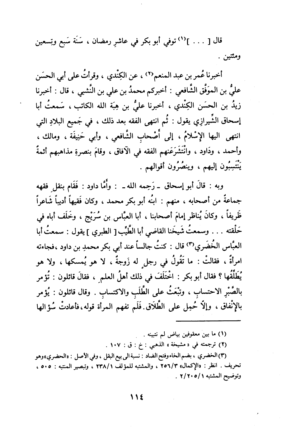 وَبِهِ: قَالَ أَبُو إِسْحَاقَ -رَحِمَهُ اللهُ-: وَأَمَّا دَاوُدُ فَقَامَ بِنَقْلِ فِقْهِهِ جَمَاعَةٌ مِنْ أَصْحَابِهِ، مِنْهُم ابْنُهُ أَبُو بَكْرٍ مُحَمَّدُ، وَكَانَ فَقِيْهاً أَدِيْباً شَاعِراً ظَرِيْفاً، وَكَانَ يُنَاظِرُ إِمَامَ أَصْحَابِنَا أَبَا العَبَّاسِ بنَ سُرَيْجٍ، وَخَلَفَ أَبَاهُ فِي حَلْقَتِهِ....، وَسَمِعْتُ شَيْخَنَا القَاضِي أَبَا الطَّيِّبِ الطَّبَرِيِّ يَقُوْلُ: سَمِعْتُ أَبَا العَبَّاسِ الخُضَرِيَّ (3) قَالَ: