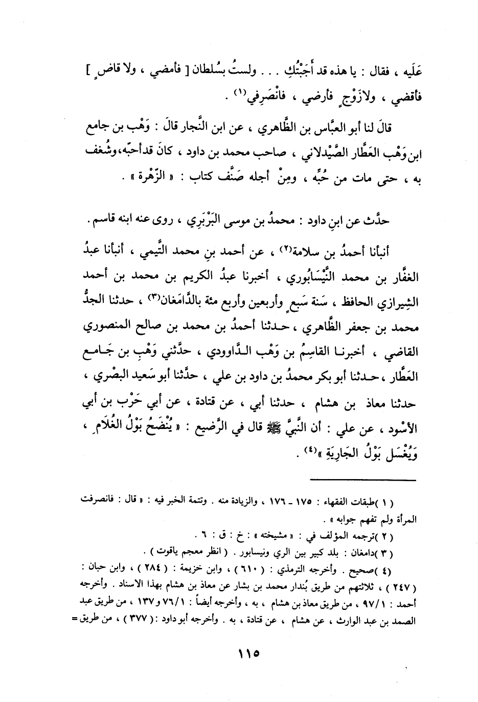 أَنْبَأَنَا أَحْمَدُ بنُ سَلاَمَةَ (2) ، عَنْ أَحْمَدَ بنِ مُحَمَّدٍ التَّيْمِيِّ، أَنْبَأَنَا عَبْدُ الغَفَّارِ بنُ مُحَمَّدٍ النَّيْسَابُورِيُّ، أَخْبَرَنَا عَبْدُ الكَرِيْمِ بنُ مُحَمَّدِ بنِ أَحْمَدَ الشِّيرَازِيُّ الحَافِظُ، سَنَةَ سَبْعٍ وَأَرْبَعِيْنَ وَأَرْبَعِ مائَةٍ بِالدَّامَغَانِ (3) ، حَدَّثَنَا الجَدُّ مُحَمَّدُ بنُ جَعْفَرٍ الظَّاهِرِيُّ، حَدَّثَنَا أَحْمَدُ بنُ مُحَمَّدِ بنِ صَالِحٍ المَنْصُوْرِيُّ القَاضِي، أَخْبَرَنَا القَاسِمُ بنُ وَهْبٍ الدَّاوُودِيُّ، حَدَّثَنِي وَهْبُ بنُ جَامِعٍ العَطَّارُ، حَدَّثَنَا أَبُو بَكْرٍ مُحَمَّدُ بنُ دَاوُدَ بنِ عَلِيٍّ، حَدَّثَنَا أَبُو سَعِيْدٍ البَصْرِيُّ، حَدَّثَنَا مُعَاذُ بنُ هِشَامٍ، حَدَّثَنَا أَبِي، عَنْ قَتَادَةَ، عَنْ أَبِي حَرْبٍ بنِ أَبِي الأَسْوَدِ، عَنْ عَلِيٍّ: