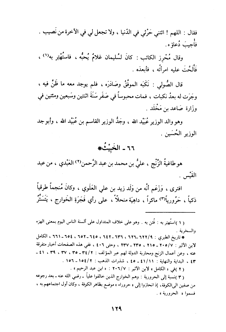 (*) تاريخ الطبري: 9 / 622 - 626، 636 - 642، 645 - 652، 654 - 661، الكامل لابن الأثير: 7 / 205 - 215، 235 - 237، وحتى 406، ففي هذه الصفحات أخبار متفرقة عنه، وعن أعمال الزنج ومحاربة الدولة لهم عبر المؤلف: 2 / 34 - 35، 37، 39، 41 - 43، البداية والنهاية: 11 / 41 - 45، شذرات الذهب: 2 / 154 - 156.
