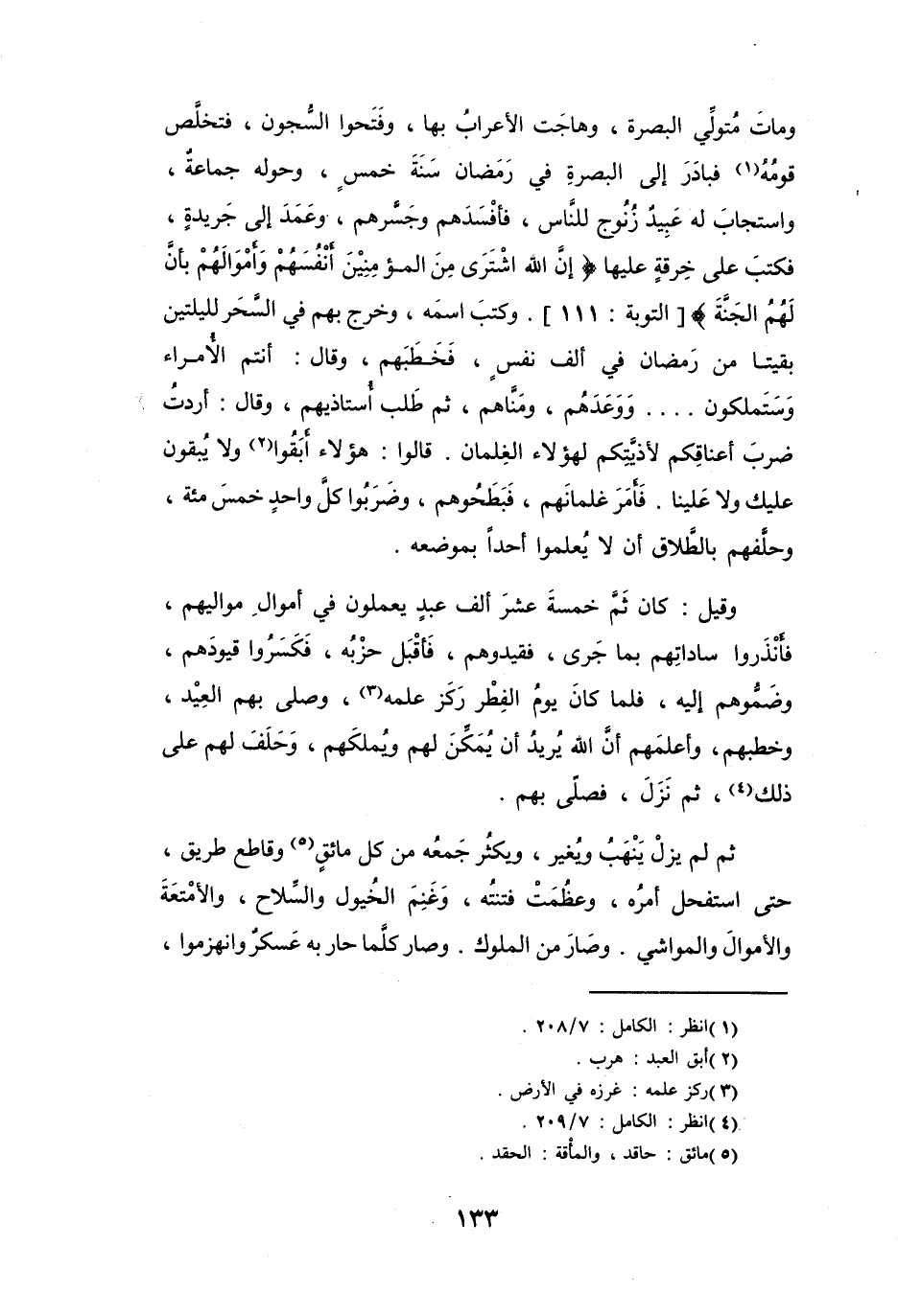 وَمَاتَ مُتَوَلِّي البَصْرَةِ، وَهَاجَتِ الأَعرَابُ بِهَا، وَفَتَحُوا السُّجُونَ، فَتَخَلَّصَ قَوْمُهُ (1) ، فَبَادَرَ إِلَى البَصْرَةِ فِي رَمَضَانَ سَنَةَ خَمْسٍ، وَحَوْلَهُ جَمَاعَةٌ، وَاسْتجَابَ لَهُ عَبِيْدٌ زُنُوجٌ لِلنَّاسِ، فَأَفْسَدَهُم وَجَسَّرَهُم، وَعَمَدَ إِلَى جَرِيْدَةٍ، فَكَتَبَ عَلَى خِرْقَةٍ عَلَيْهَا: {إِنَّ اللهَ اشْتَرَى مِنَ المُؤْمِنِيْنَ أَنْفُسَهُم وَأَمْوَالَهُمْ بِأَنَّ لَهُمُ الجَنَّةَ} [التَّوبَة: 111] .
