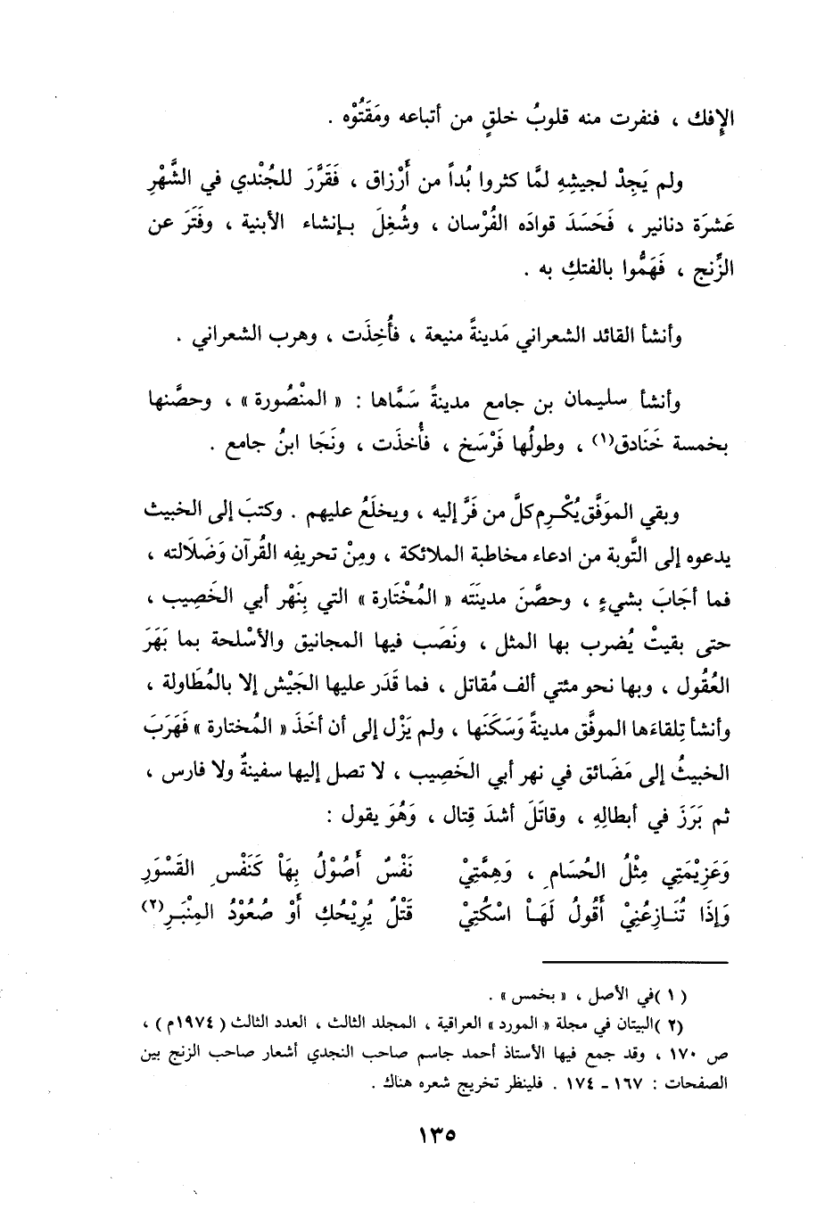 (2) البيتان في مجلة " المورد " العراقية، المجلد الثالث، العدد الثالث (1974 م) ، ص 170، وقد جمع فيها الأستاذ أحمد جاسم صاحب النجدي أشعار صاحب الزنج بين الصفحات: 167 - 174. فلينظر تخريج شعره هناك.