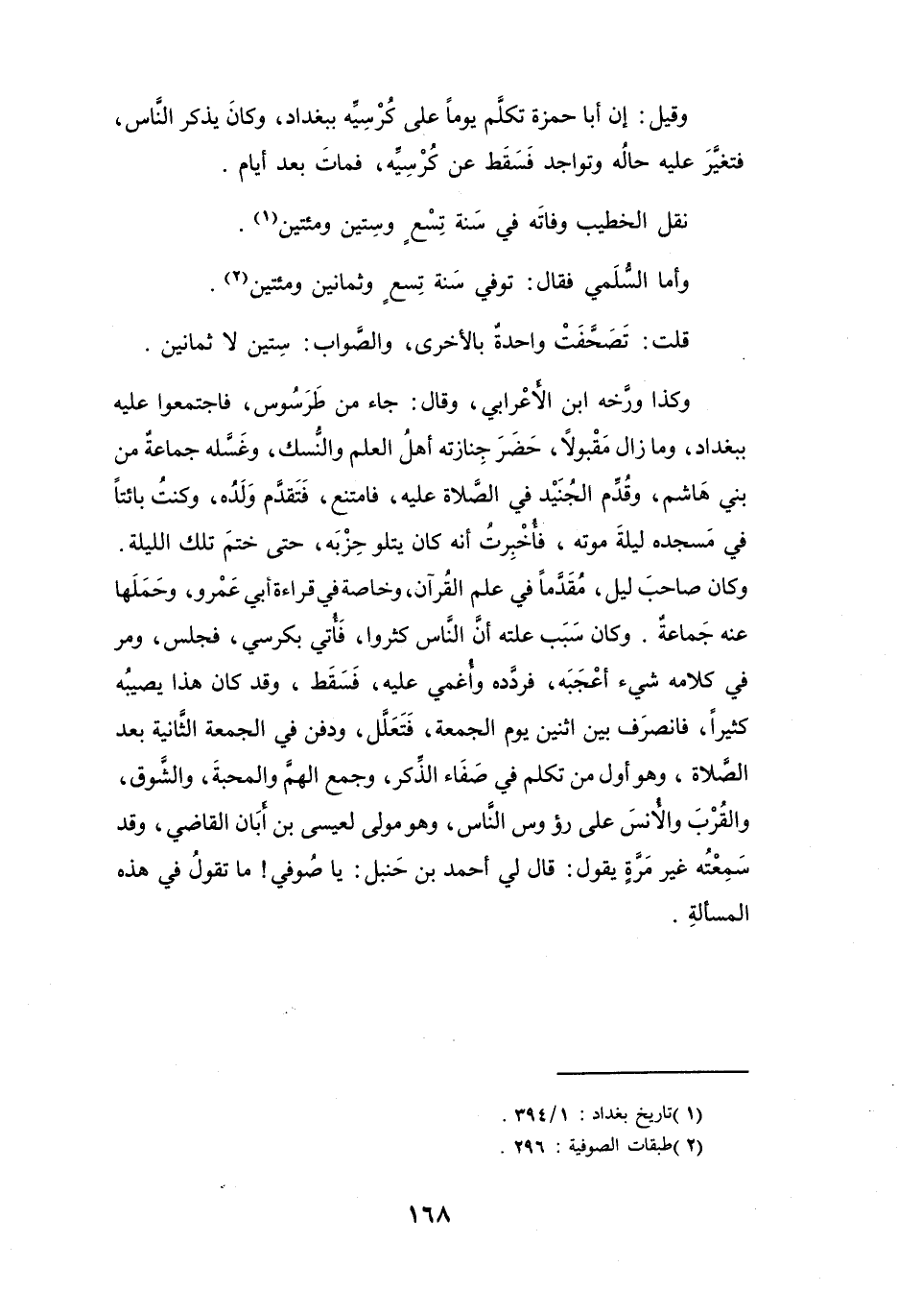 وَكَانَ سَبَبَ عِلَّتِهِ أَنَّ النَّاسَ كَثرُوا، فَأُتِي بكُرْسِيٍّ، فَجَلَسَ، وَمَرَّ فِي كَلاَمِهِ شَيْءٌ أَعْجَبَهُ، فَرَدَّدَهُ وَأُغْمِيَ عَلَيْهِ، فَسَقَطَ، وَقَدْ كَانَ هَذَا يُصِيْبُهُ كَثِيْراً، فَانْصَرَفَ بَيْنَ اثْنَيْنِ يَوْمَ الجُمُعَةِ، فَتَعَلَّلَ، وَدُفِنَ فِي الجُمْعَةِ الثَّانِيَةِ بَعْدِ الصَّلاَةِ، وَهُوَ أَوَّلُ مَنْ تَكَلَّمَ فِي صَفَاءِ الذِّكْرِ، وَجَمَعَ الهَمَّ وَالمَحَبَّةَ، وَالشَّوْقَ وَالقُرْبَ وَالأُنْسَ عَلَى رُؤُوْسِ النَّاسِ، وَهُوَ مَوْلَى لِعِيْسَى بنِ أَبَانٍ القَاضِي، وَقَدْ سَمِعْتُهُ غَيْرَ مَرَّةٍ يَقُوْلُ: قَالَ لِي أَحْمَدُ بنُ حَنْبَلٍ: يَا صُوفِيُّ! مَا تَقُوْلُ فِي هَذِهِ المَسْأَلَةِ؟