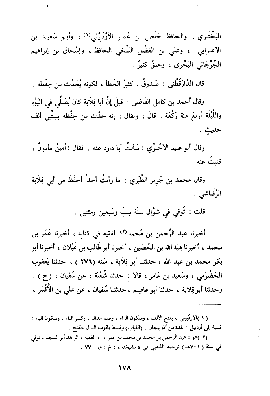 أَخْبَرَنَا عَبْدُ الرَّحْمَنِ بنُ مُحَمَّدٍ (2) الفَقِيْهُ فِي كِتَابِهِ، أَخْبَرَنَا عُمَرُ بنُ مُحَمَّدٍ، أَخْبَرَنَا هِبَةُ اللهِ بنُ الحُصَيْنِ، أَخْبَرَنَا أَبُو طَالِبٍ بنُ غَيْلاَنَ، أَخْبَرَنَا أَبُو بَكْرٍ مُحَمَّدُ بنُ عَبْدِ اللهِ، حَدَّثَنَا أَبُو قِلاَبَةَ سَنَةَ (276) ، حَدَّثَنَا يَعْقُوْبُ الحَضْرَمِيُّ، وَسَعِيْدُ بنُ عَامِرٍ، قَالاَ: