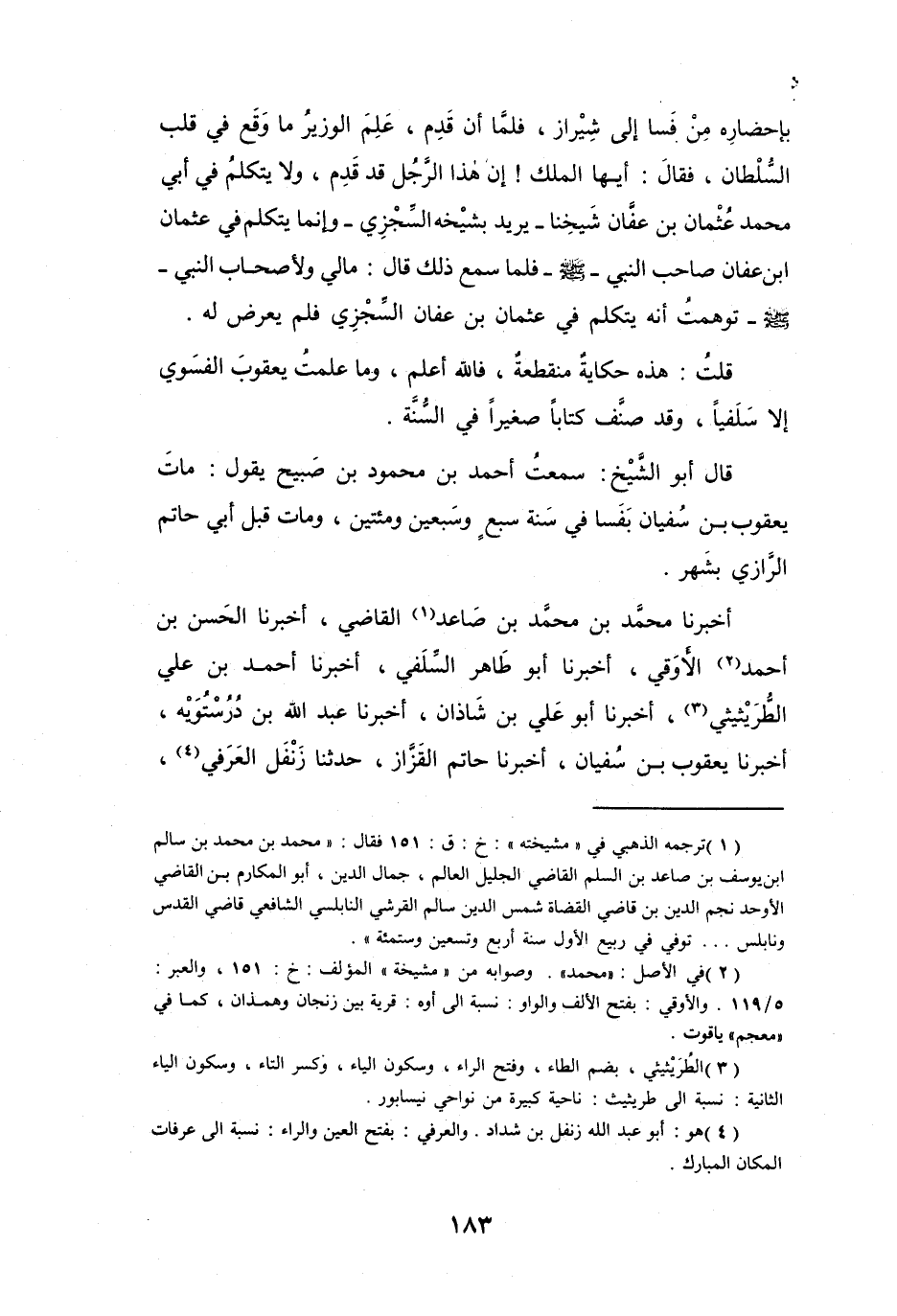 بِإِحضَارِهِ مِنْ فَسَا إِلَى شِيْرَازَ، فَلَمَّا أَنْ قَدِمَ، عَلِمَ الوَزِيْرُ مَا وَقَعَ فِي قَلْبِ السُّلْطَانِ، فَقَالَ: أَيُّهَا المَلِكُ! إِنَّ هَذَا الرَّجُلَ قَدْ قَدِمَ، وَلاَ يَتَكَلَّمُ فِي أَبِي مُحَمَّد عُثْمَانَ بنِ عَفَّانَ شَيخِنَا -يُرِيْدُ بِشَيْخِهِ السِّجْزِيِّ - وَإِنَّمَا يَتَكَلَّمُ فِي عُثْمَانَ بنِ عَفَّانَ صَاحِبِ النَّبِيِّ -صَلَّى اللَّهُ عَلَيْهِ وَسَلَّمَ- فَلَمَّا سَمِعَ ذَلِكَ قَالَ: