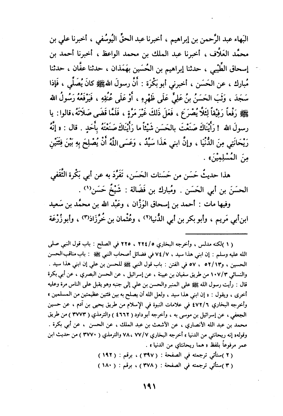 (1) لكنه مدلس، وأخرجه البخاري 5 / 224، 225 في الصلح: باب قول النبي صلى الله عليه وسلم: إن ابني هذا سيد، 7 / 74 في فضائل أصحاب النبي صلى الله عليه وسلم: باب مناقب الحسن الحسين، و13 / 52، 57 في الفتن: باب قول النبي صلى الله عليه وسلم للحسن بن علي إن ابني هذا سيد.