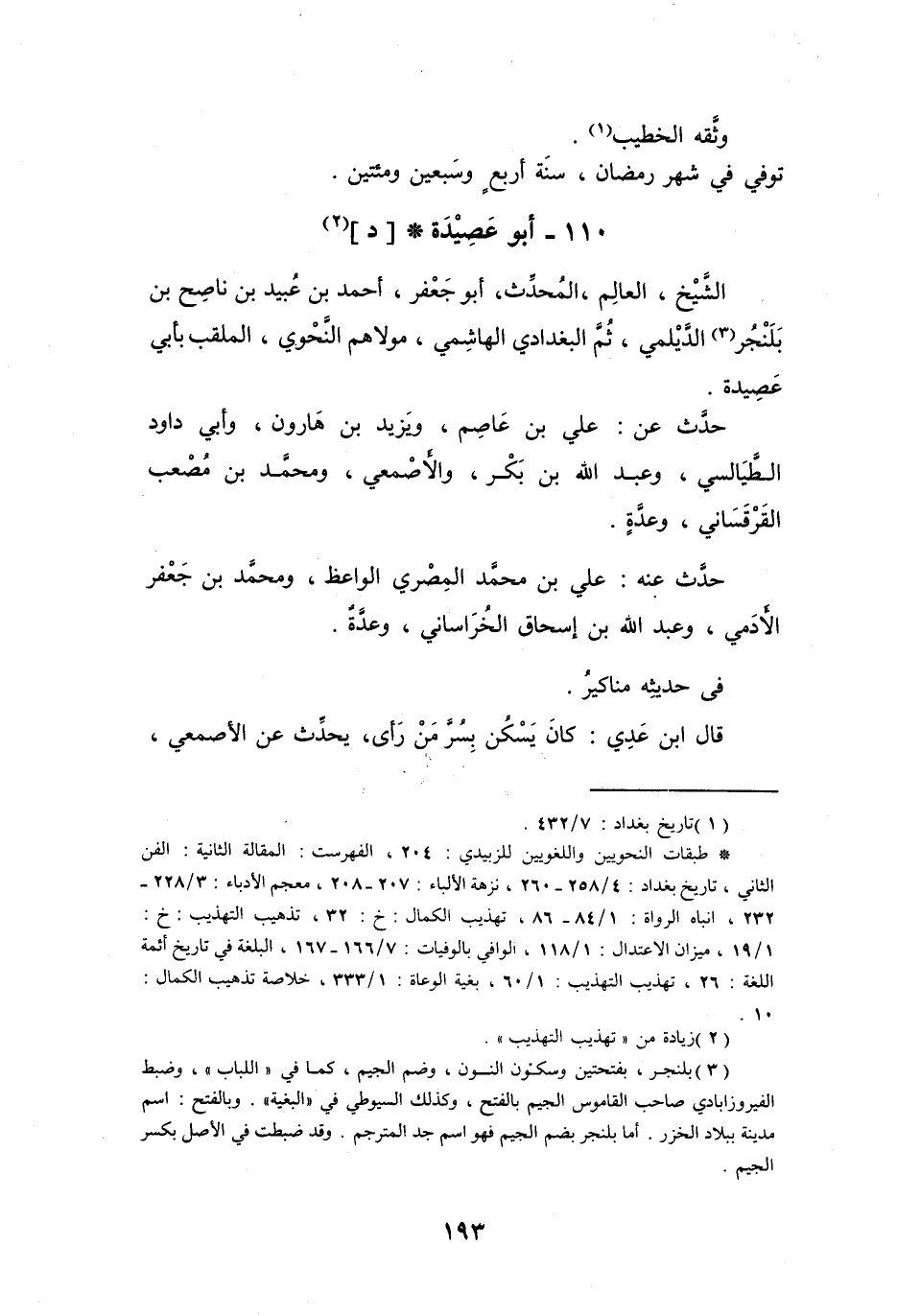 (*) طبقات النحويين واللغويين للزبيدي: 204، الفهرست: المقالة الثانية: الفن الثاني، تاريخ بغداد: 4 / 258 - 260، نزهة الالباء: 207 - 208، معجم الأدباء: 3 / 228 - 232، انباه الرواة: 1 / 84 - 86، تهذيب الكمال: خ: 32، تذهيب التهذيب: خ: 1 / 19، ميزان الاعتدال: 1 / 118، الوافي بالوفيات: 7 / 166 - 167، البلغة في تاريخ أئمة اللغة: 26، تهذيب التهذيب: 1 / 60، بغية الوعاة: 1 / 333، خلاصة تذهيب الكمال: 10.