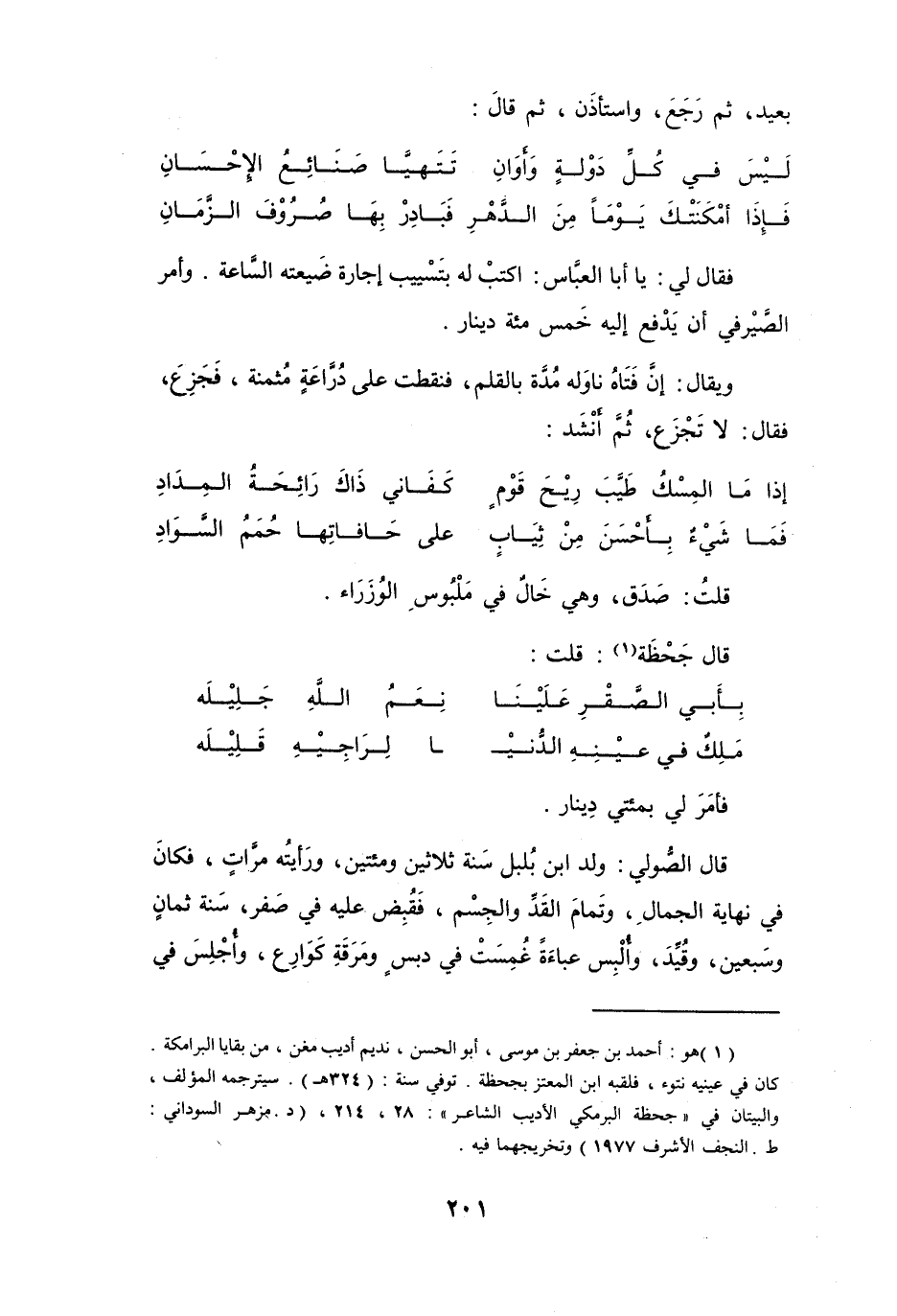 (1) هو: أحمد بن جعفر بن موسى، أبو الحسن، نديم أديب مغن، من بقايا البرامكة.