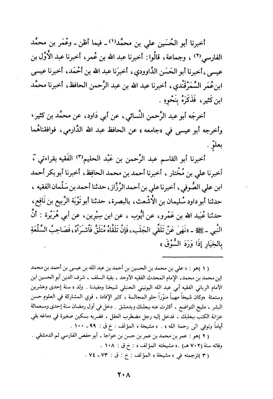أَخْبَرَنَا أَبُو الحُسَيْنِ عَلِيُّ بنُ مُحَمَّدٍ (1) - فِيمَا أَظُنُّ - وَعُمَرُ بنُ مُحَمَّدٍ الفَارِسِيُّ (2) ، وَجَمَاعَةٌ، قَالُوا: أَخْبَرَنَا عَبْدُ اللهِ بنُ عُمَرَ، أَخْبَرَنَا عَبْدُ الأَوَّلِ بنُ عِيْسَى، أَخْبَرَنَا أَبُو الحَسَنِ الدَّاوُودِيُّ، أَخْبَرَنَا عَبْدُ اللهِ بنُ أَحْمَدَ، أَخْبَرَنَا عِيْسَى بنُ عُمَرَ السَّمَرْقَنْدِيُّ، أَخْبَرَنَا عَبْدُ اللهِ بنُ عَبْدِ الرَّحْمَنِ الحَافِظُ، أَخْبَرَنَا مُحَمَّدُ بنُ كَثِيْرٍ، فَذَكَرَهُ بِنَحْوِهِ.