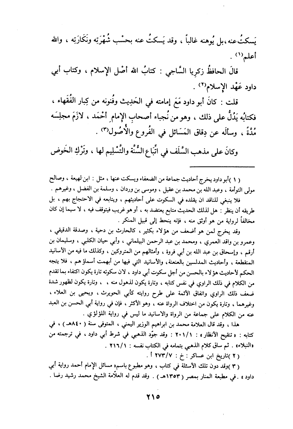 قَالَ الحَافِظُ زَكَرِيَّا السَّاجِيُّ: كِتَابُ اللهِ أَصْلُ الإِسْلاَمِ، وَكِتَابُ أَبِي دَاوُدَ عَهْدُ الإِسْلاَمِ (2) .