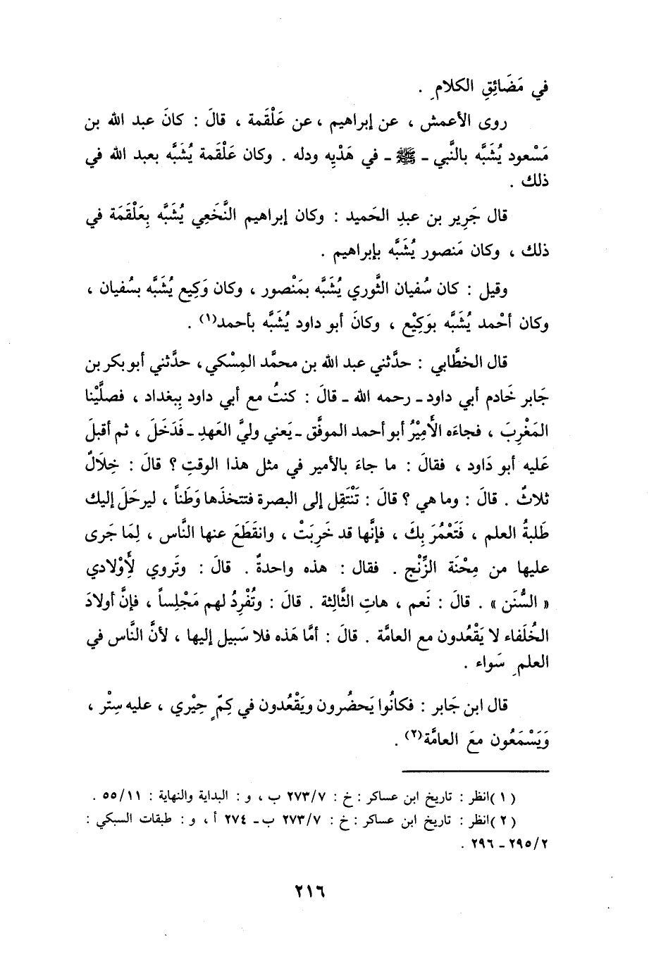 وَقِيْلَ: كَانَ سُفْيَانُ الثَّوْرِيُّ يُشَبَّهُ بِمَنْصُوْرٍ، وَكَانَ وَكِيْعٌ يُشَبَّهُ بِسُفْيَانَ، وَكَانَ أَحْمَدُ يُشَبَّهُ بوَكِيْعٍ، وَكَانَ أَبُو دَاوُدَ يُشَبَّهُ بِأَحْمَدَ (1) .