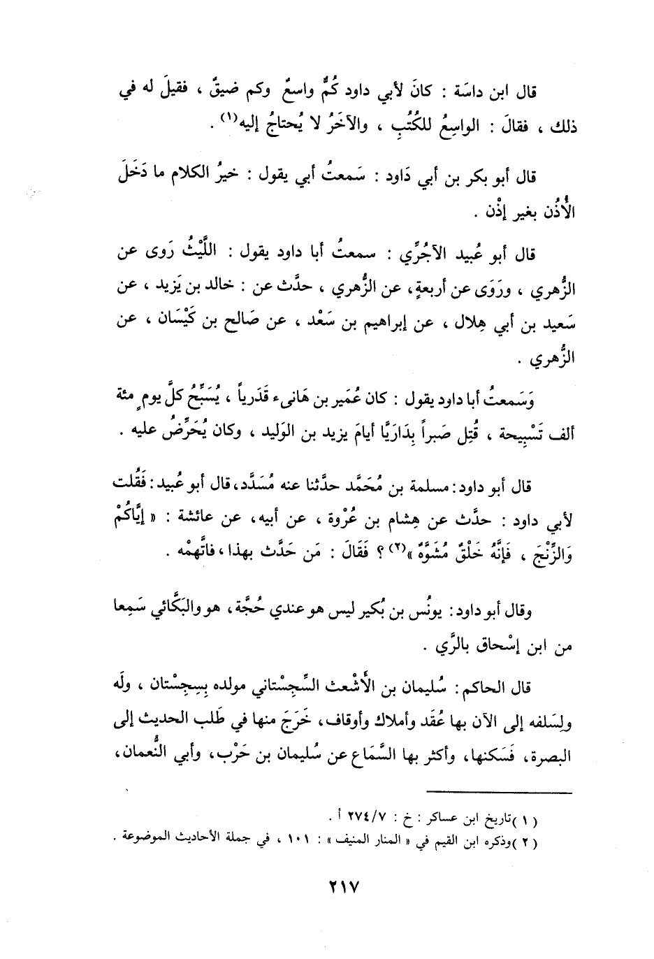 قَالَ ابْنُ دَاسَةَ: كَانَ لأَبِي دَاوُدَ كُمٌّ وَاسِعٌ، وَكُمٌّ ضَيْقٌ، فَقِيْلَ لَهُ فِي ذَلِكَ، فَقَالَ: الوَاسِعُ لِلْكُتُبِ، وَالآخَرُ لاَ يُحْتَاجُ إِلَيْهِ (1) .