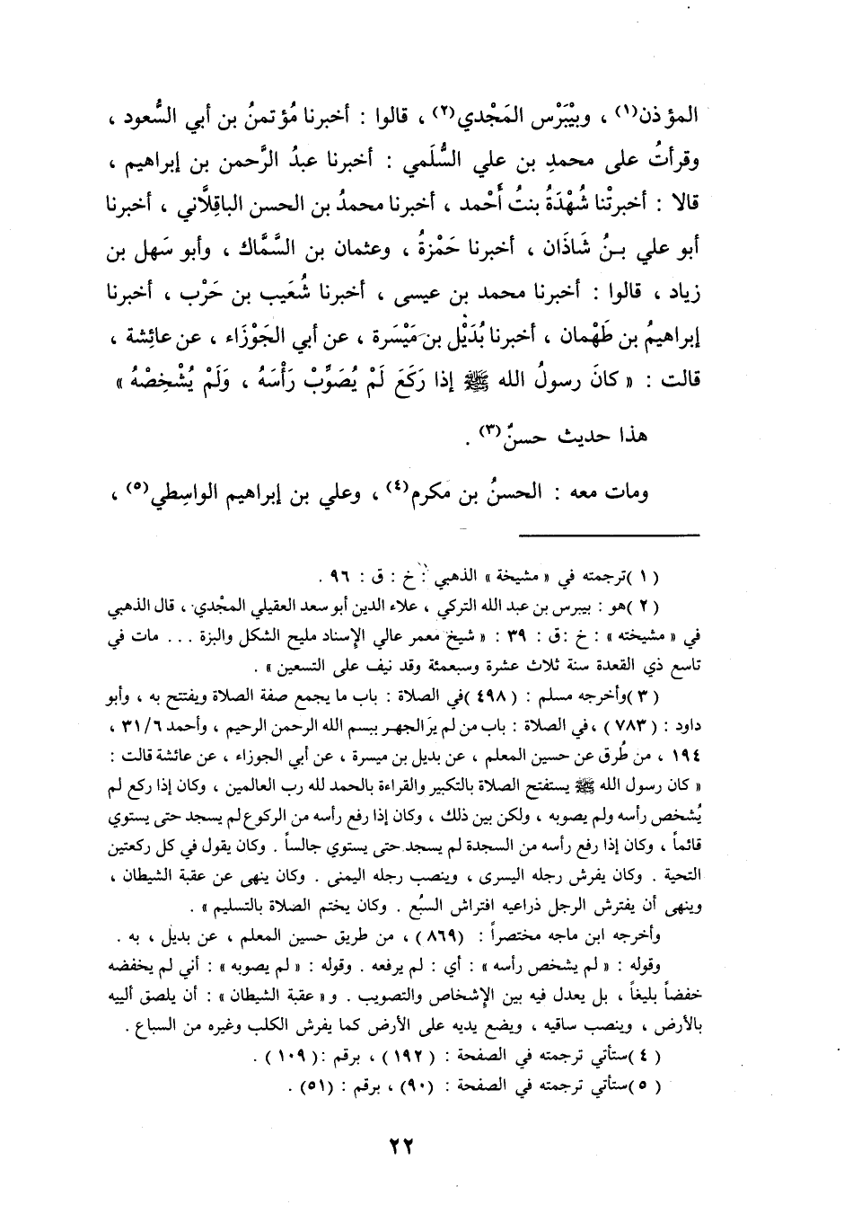 (2) هو: بيبرس بن عبد الله التركي، علاء الدين أبو سعد العقيلي المجدي، قال الذهبي في " مشيخته ": خ: ق: 39: " شيخ معمر عالي الإسناد مليح الشكل والبزة ... مات في تاسع ذي القعدة سنة ثلاث عشرة وسبعمئة وقد نيف على التسعين ".