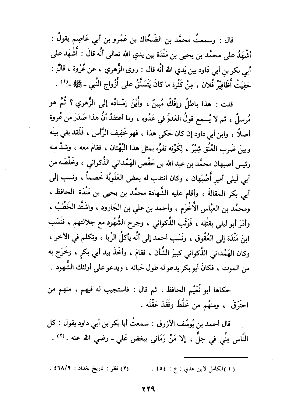 قُلْتُ: هَذَا بَاطِلٌ وَإِفْكٌ مُبِيْنٌ، وَأَيْنَ إِسْنَادُهُ إِلَى الزُّهْرِيِّ؟ ثُمَّ هُوَ مُرْسَلٌ، ثُمَّ لاَ يُسْمَعُ قَوْلُ العَدُوِّ فِي عَدُوِّه، وَمَا أَعْتَقِدُ أَنَّ هَذَا صَدَرَ مِنْ عُرْوَةَ أَصْلاً، وَابْنُ أَبِي دَاوُدَ إِنْ كَانَ حَكَى هَذَا، فَهُوَ خَفِيْفُ الرَّأْسِ، فَلَقَدْ بَقِيَ بَيْنَهُ وَبَيْنَ ضَرْبِ العُنُقِ شِبْرٌ، لِكَوْنِهِ تَفَوَّهَ بِمِثْلِ هَذَا البُهتَانِ، فَقَامَ مَعَهُ، وَشَدَّ مِنْهُ رَئِيْسَ أَصْبَهَانَ؛ مُحَمَّدَ بنَ عَبْدِ اللهِ بنِ حَفْصٍ الهَمْدَانِيَّ الذَّكوَانِيَّ، وَخَلَّصَهُ مِنْ أَبِي لَيْلَى أَمِيْرِ أَصْبَهَانَ، وَكَانَ انتَدَبَ لَهُ بَعْضَ العَلَوِيَّةِ خَصْماً، وَنَسَبَ إِلَى أَبِي بَكْرٍ المَقَالَةَ، وَأَقَامَ عَلَيْهِ الشَّهَادَةَ مُحَمَّدُ بنُ يَحْيَى بنِ مَنْدَةَ الحَافِظُ، وَمُحَمَّدُ بنُ العَبَّاسِ الأَخْرَمُ، وَأَحْمَدُ بنُ عَلِيِّ بنِ الجَارُوْدِ، وَاشْتَدَّ الخَطْبُ، وَأَمَرَ أَبُو لَيْلَى بِقَتْلِهِ، فَوَثَبَ الذَّكوَانِيُّ، وَجَرَحَ الشُّهُوْدَ مَعَ جَلاَلَتِهِم، فَنَسَبَ ابْنَ مَنْدَةَ إِلَى العُقُوْقِ، وَنَسَبَ أَحْمَدَ إِلَى أَنَّهُ يَأْكُلُ الرِّبَا، وَتَكَلَّمَ فِي الآخَر، وَكَانَ الهَمْدَانِيُّ الذَّكوَانِيُّ كَبِيرَ الشَّأْنِ، فَقَامَ، وَأَخَذَ بِيَدِ أَبِي بَكْرٍ، وَخَرَجَ بِهِ مِنَ المَوْتِ، فَكَانَ أَبُو بَكْرٍ يَدْعُو لَهُ طُوْلَ حَيَاتِهِ، وَيَدْعُو عَلَى أَوْلَئِكَ الشُّهُوْدِ.