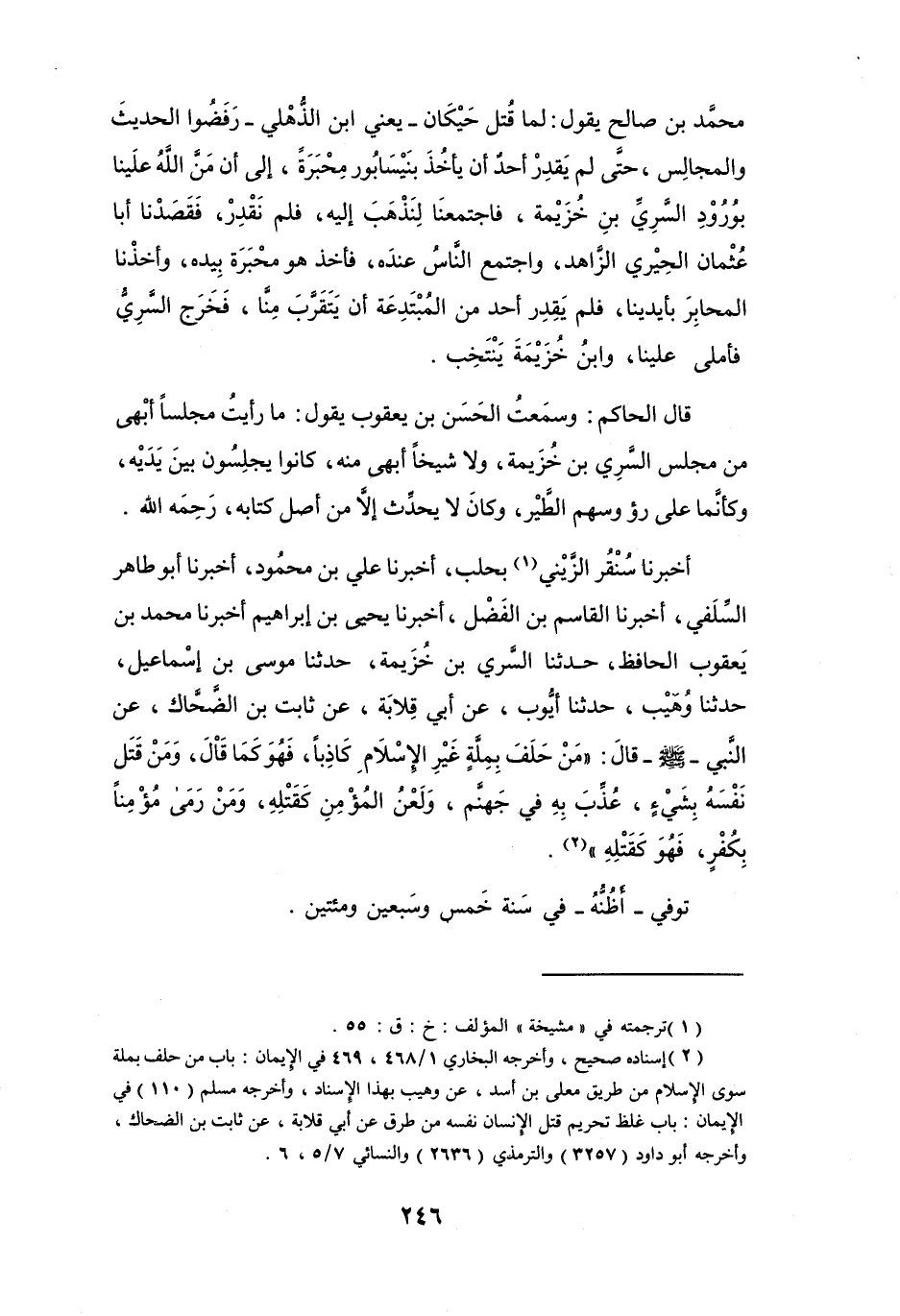 أَخْبَرَنَا سُنْقُرُ الزَّيْنِيُّ (1) بِحَلَبَ، أَخْبَرَنَا عَلِيُّ بنُ مَحْمُوْدٍ، أَخْبَرَنَا أَبُو طَاهِرٍ السِّلَفِيُّ، أَخْبَرَنَا القَاسِمُ بنُ الفَضْلِ، أَخْبَرَنَا يَحْيَى بنُ إِبْرَاهِيْمَ، أَخْبَرَنَا مُحَمَّدُ بنُ يَعْقُوْبَ الحَافِظُ، حَدَّثَنَا السَّرِيُّ بنُ خُزَيْمَةَ، حَدَّثَنَا مُوْسَى بنُ إِسْمَاعِيْلَ، حَدَّثَنَا وُهَيْبٌ، حَدَّثَنَا أَيُّوْبُ، عَنْ أَبِي قِلاَبَةَ، عَنْ ثَابِتِ بنِ الضَّحَّاكِ: