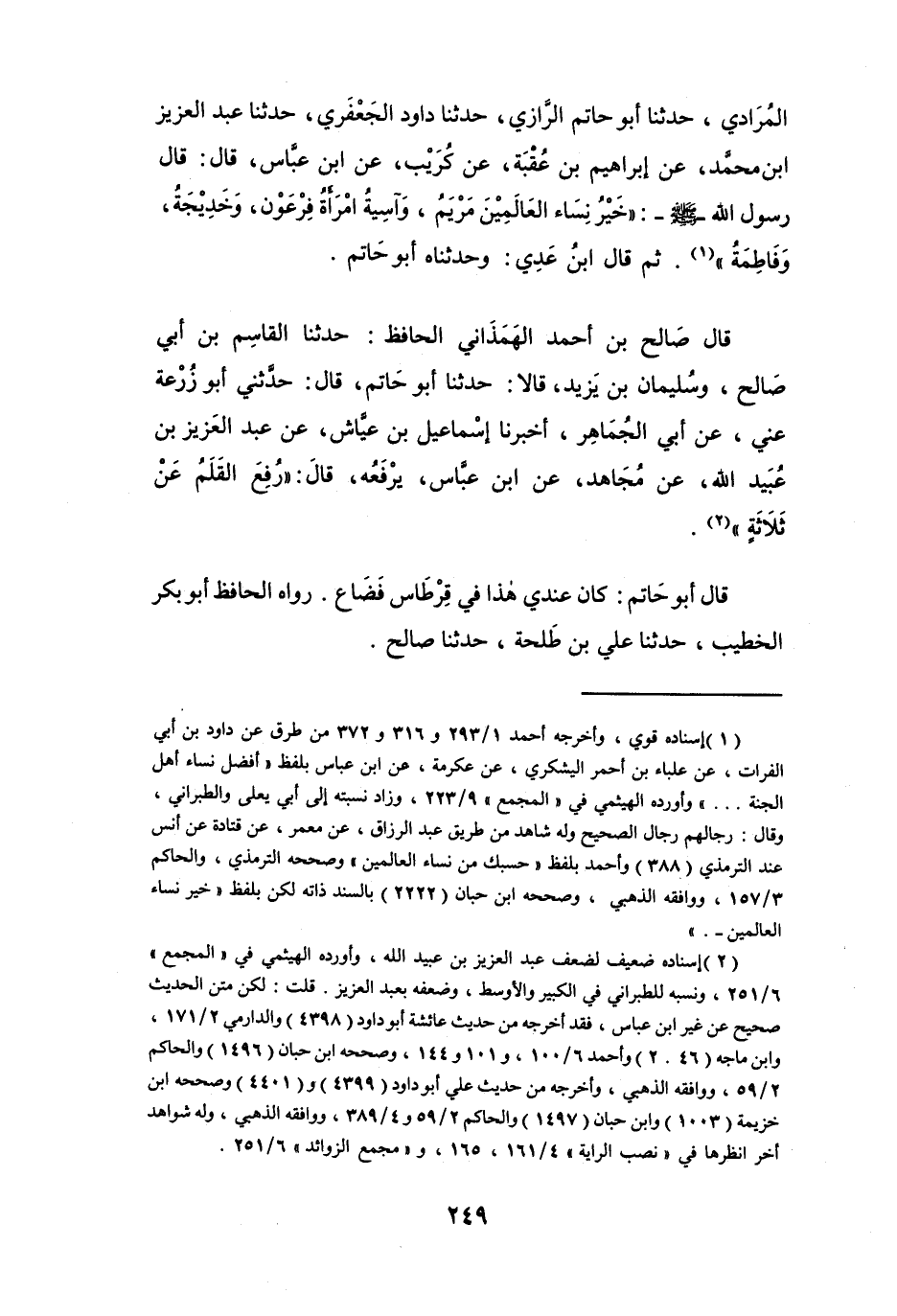 حَدَّثَنَا أَبُو حَاتِمٍ قَالَ: حَدَّثَنِي أَبُو زُرْعَةَ عَنِّي، عَنْ أَبِي الجُمَاهِرِ، أَخْبَرَنَا إِسْمَاعِيْلُ بنُ عَيَّاشٍ، عَنْ عَبْدِ العَزِيْزِ بنِ عُبَيْدِ اللهِ، عَنْ مُجَاهِدٍ، عَنِ ابْنِ عَبَّاسٍ، يَرْفَعُهُ، قَالَ: (رُفِعَ القَلَمُ عَنْ ثَلاَثَةٍ (2)) .