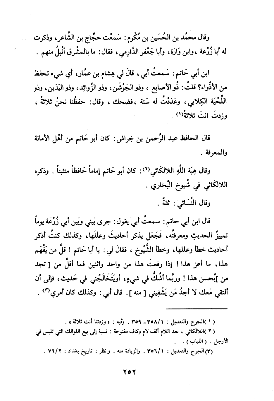 وَقَالَ هِبَةُ اللهِ اللاَّلْكَائِيُّ (2) : كَانَ أَبُو حَاتِمٍ إِمَاماً حَافِظاً مُتَثَبِّتاً.
