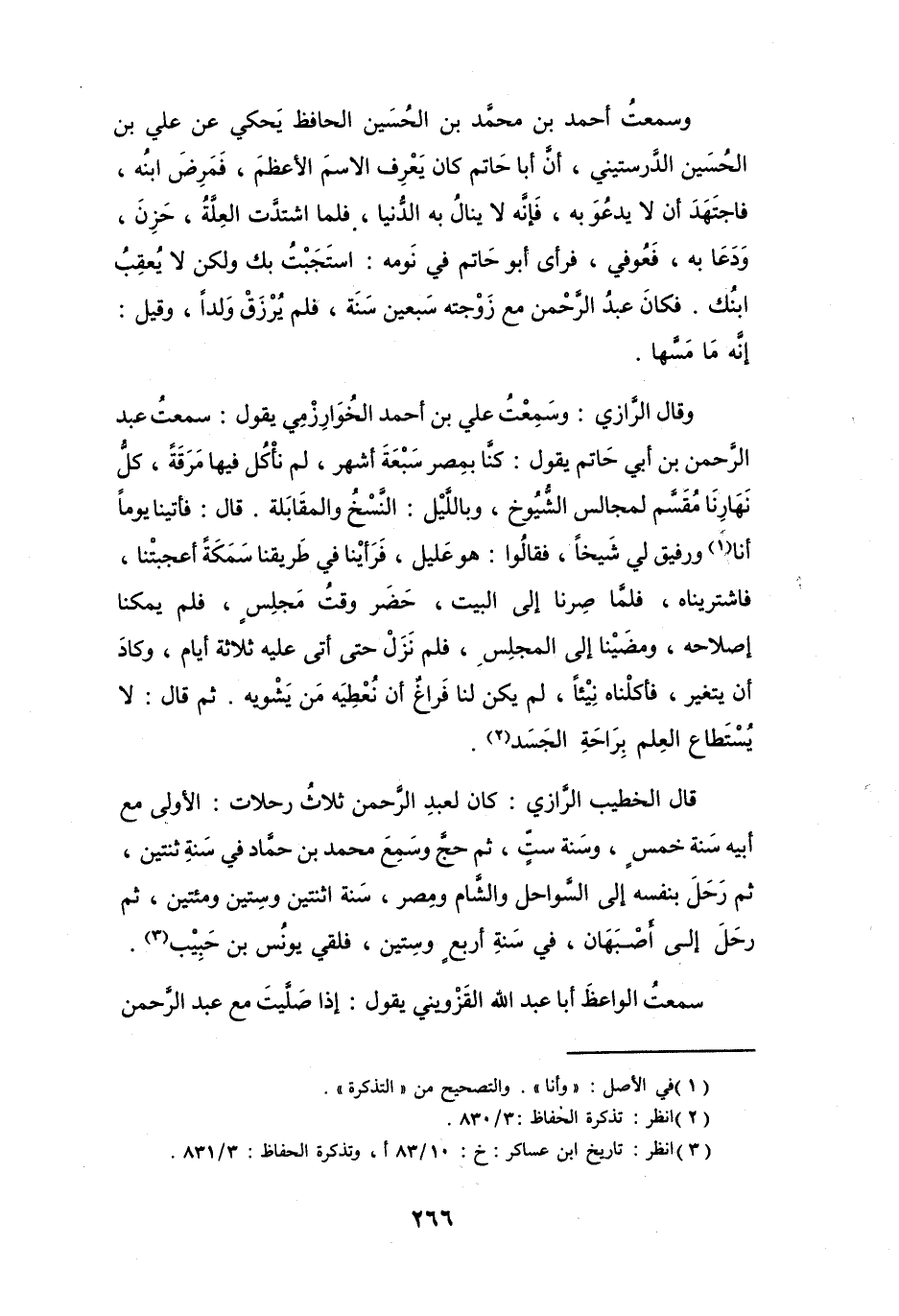 وَقَالَ الرَّازِيُّ: وَسَمِعْتُ عَلِيَّ بنَ أَحْمَدَ الخُوَارِزْمِيَّ يَقُوْلُ: سَمِعْتُ عَبْدَ الرَّحْمَنِ بنَ أَبِي حَاتِمٍ يَقُوْلُ: