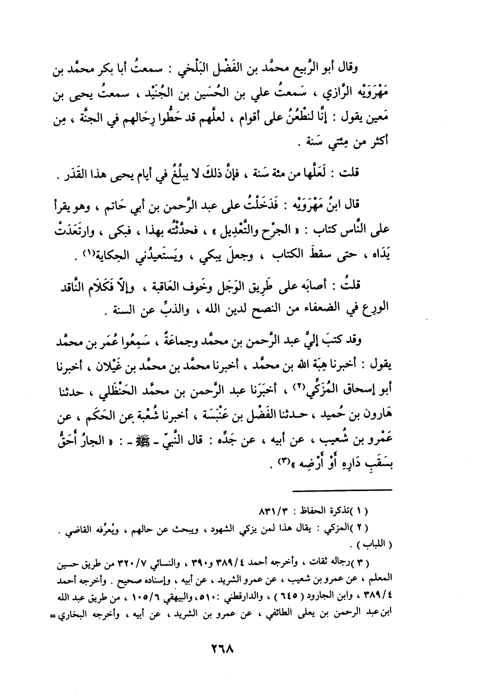وَقَالَ أَبُو الرَّبِيْعِ مُحَمَّدُ بنُ الفَضْلِ البَلْخِيُّ: سَمِعْتُ أَبَا بَكْرٍ مُحَمَّدَ بنَ مَهْرَوَيْه الرَّازِيَّ، سَمِعْتُ عَلِيَّ بنَ الحُسَيْنِ بنِ الجُنَيْدِ، سَمِعْتُ يَحْيَى بنَ مَعِيْنٍ يَقُوْلُ: