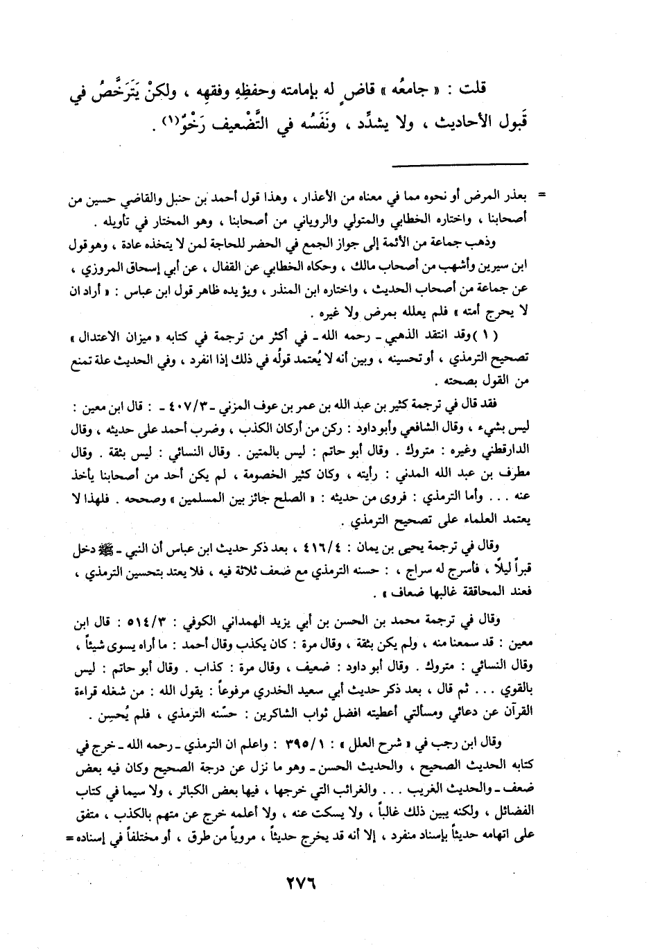 (1) وقد انتقد الذهبي - رحمه الله - في أكثر من ترجمة في كتابه " ميزان الاعتدال " تصحيح الترمذي، أو تحسينه، وبين أنه لا يعتمد قوله في ذلك إذا انفرد، وفي الحديث علة تمنع من القول بصحته.