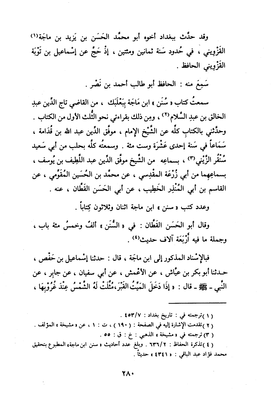 فَبِالإِسْنَادِ المَذْكُوْر إِلَى ابْنِ مَاجَهْ، قَالَ: حَدَّثَنَا إِسْمَاعِيْلُ بنُ حَفْصٍ، حَدَّثَنَا أَبُو بَكْرٍ بنُ عَيَّاشٍ، عَنِ الأَعْمَشِ، عَنْ أَبِي سُفْيَانَ: