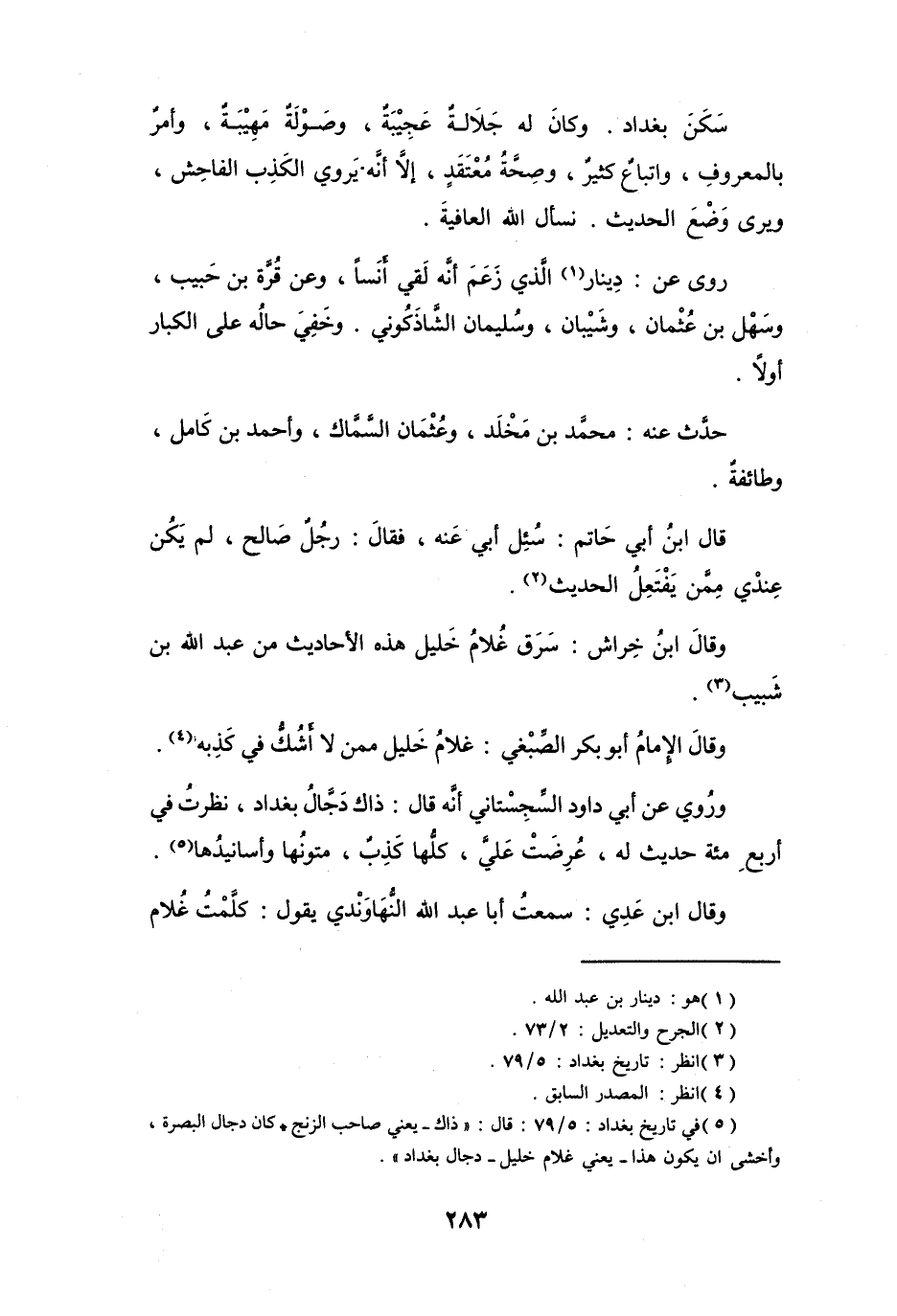 وَقَالَ الإِمَامُ أَبُو بَكْرٍ الصِّبْغِيُّ: غُلاَمُ خَلِيْلٍ مِمَّنْ لاَ أَشُكُّ فِي كَذِبِهِ (4) .