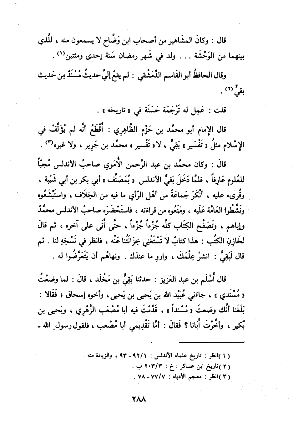 قَالَ: وَكَانَ مُحَمَّدُ بنُ عَبْدِ الرَّحْمَنِ الأُموِيُّ صَاحِبُ الأَنْدَلُس مُحِبّاً للعُلُوْمِ عَارِفاً، فَلَمَّا دَخَلَ بَقِيٌّ الأَنْدَلُسَ (بِمُصَنَّفِ) أَبِي بَكْرٍ بنِ أَبِي شَيْبَةَ، وَقُرِئ عَلَيْهِ، أَنْكَرَ جَمَاعَةٌ مِنْ أَهْلِ الرَّأْي مَا فِيْهِ مِنَ الخِلاَفِ، وَاسْتَبْشَعُوهُ وَنَشَّطُوا العَامَّةَ عَلَيْهِ، وَمَنَعُوهُ مِنْ قِرَاءَتِهِ، فَاسْتَحْضَرَهُ صَاحِبُ الأَنْدَلُسِ مُحَمَّدٌ وَإِيَّاهُم، وَتَصَفَّحَ الكِتَابَ كُلَّهُ جُزْءاً جُزْءاً، حَتَّى أَتَى عَلَى آخِرِهِ، ثُمَّ قَالَ لخَازِنِ الكُتُبِ: هَذَا كِتَابٌ لاَ تَسْتغْنِي خِزَانَتُنَا عَنْهُ، فَانْظُرْ فِي نَسْخِهِ لَنَا.