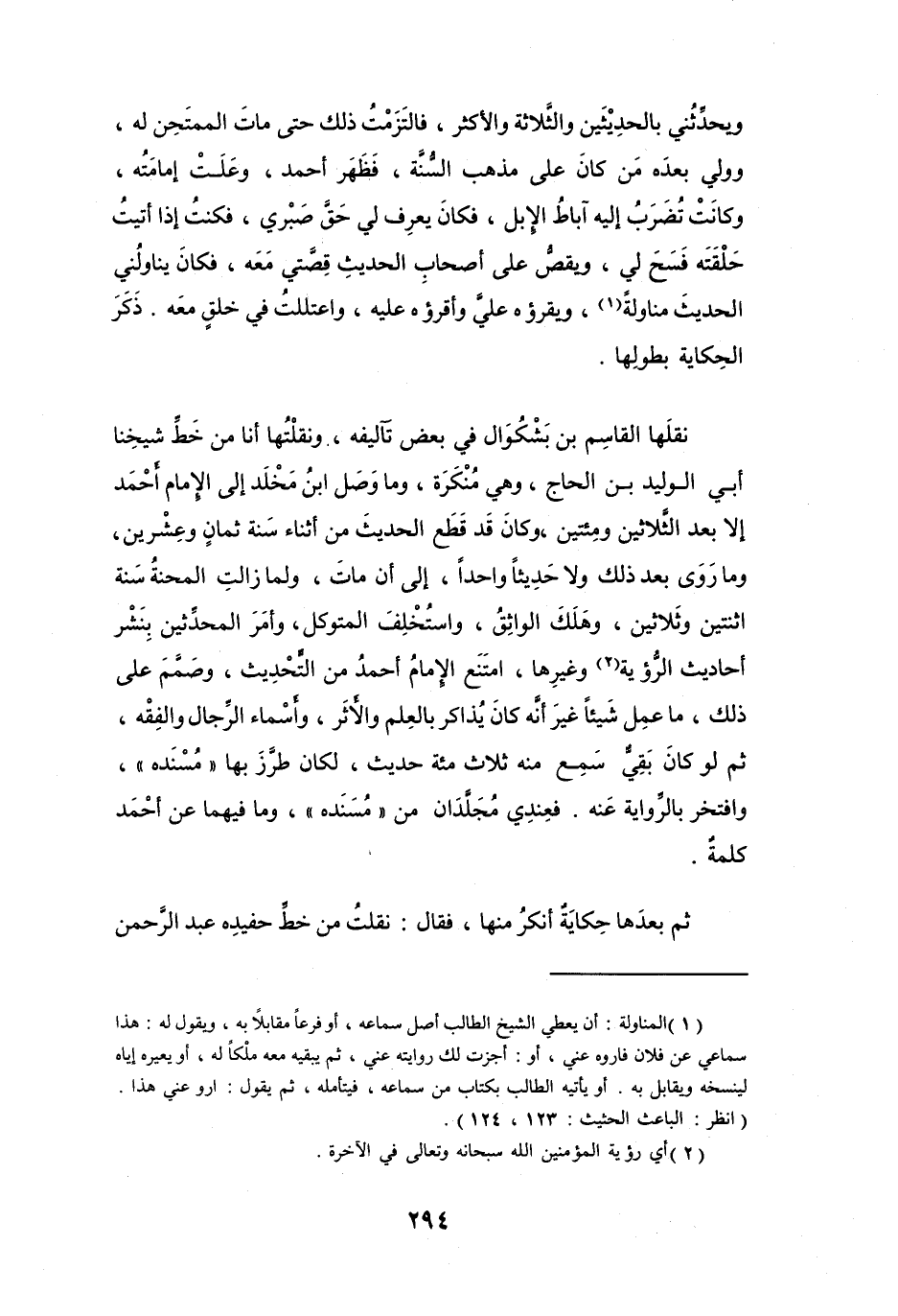 نَقَلَهَا القَاسِمُ بنُ بَشْكُوَالَ فِي بَعْضِ تَآلِيْفِهِ، وَنَقَلْتُهَا أَنَا مِنْ خَطِّ شَيْخِنَا؛ أَبِي الوَلِيْدِ بنِ الحَاج، وَهِيَ مُنْكَرَةٌ، وَمَا وَصَلَ ابْنُ مَخْلَدٍ إِلى الإِمَامِ أَحْمَدَ إِلاَّ بَعْدَ الثَّلاثِيْنَ وَمائَتَيْنِ، وَكَانَ قَدْ قَطَعَ الحَدِيْثَ مِنْ أَثْنَاءِ سَنَةَ ثَمَانٍ وَعِشْرِيْنَ، وَمَا رَوَى بَعْدَ ذَلِكَ وَلاَ حَدِيْثاً وَاحِداً، إِلَى أَنْ مَاتَ، وَلَمَّا زَالَتِ المِحْنَةُ سَنَةَ اثْنَتَيْنِ وَثَلاثِيْنَ، وَهَلَكَ الوَاثِقُ، وَاسْتُخْلِفَ المُتَوَكِّلُ، وَأَمَرَ المُحَدِّثِيْنَ بِنَشْرِ أحَادِيْثَ الرُّؤْيَةِ (2) وَغَيْرِهَا، امتَنَعَ الإِمَامُ أَحْمَدُ مِنَ التَّحْدِيْثِ، وَصَمَّمَ عَلَى ذَلِكَ، مَا عَمِلَ شَيْئاً غَيْرَ أَنَّهُ كَانَ يُذَاكِرُ بِالعِلْمِ وَالأَثَرِ، وَأَسْمَاءِ الرِّجَالِ وَالفِقْهِ، ثُمَّ لَوْ كَانَ بَقِيٌّ سَمِعَ مِنْهُ ثَلاثَ مائَةِ حَدِيْثٍ، لكَانَ طَرَّزَ بِهَا (مُسْنَدَهُ) وَافتَخَرَ بِالرِّوَايَةِ عَنْهُ.
