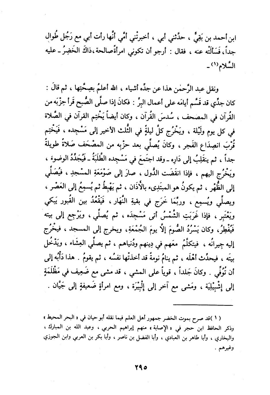 بنِ أَحْمَدَ بنِ بَقِيٍّ، حَدَّثَنِي أَبِي، أَخْبَرَتْنِي أُمِّي أَنَّهَا رَأَتْ أَبِي مَعَ رَجُلٍ طُوَالٍ جِدّاً، فَسَأَلَتْهُ عَنْهُ، فَقَالَ: أَرْجُو أَنْ تَكُوْنِي امْرَأَةً صَالِحَةً، ذَاكَ الخَضِرُ -عَلَيْهِ السَّلاَمُ- (1) .