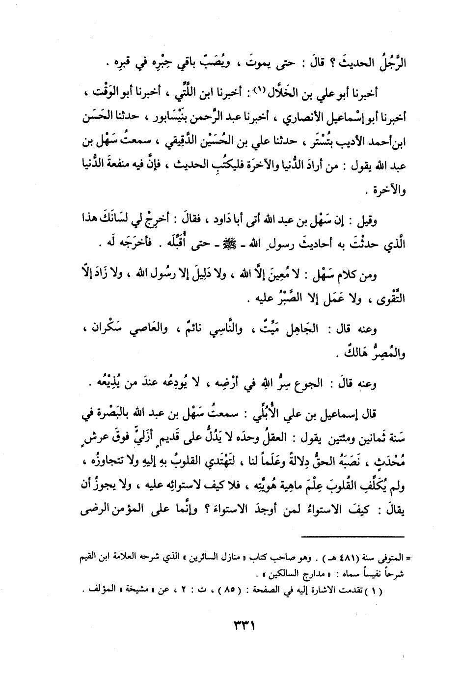 أَخْبَرَنَا أَبُو عَلِيٍّ بنُ الخَلاَّلِ (1) ، أَخْبَرَنَا ابْنُ اللَّتِّيِّ، أَخْبَرَنَا أَبُو الوَقْتِ، أَخْبَرَنَا أَبُو إِسْمَاعِيْلَ الأَنْصَارِيُّ، أَخْبَرَنَا عَبْدُ الرَّحْمَنِ بِنَيْسَابُوْرَ، حَدَّثَنَا الحَسَنُ بنُ أَحْمَدَ الأَدِيْبُ بِتُسْتَرَ، حَدَّثَنَا عَلِيُّ بنُ الحُسَيْنِ الدَّقِيْقِيُّ، سَمِعْتُ سَهْلَ بنَ عَبْدِ اللهِ يَقُوْلُ: