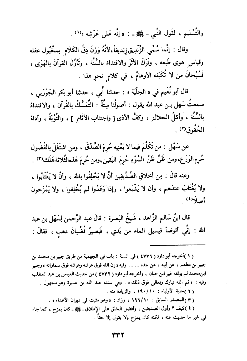 عَنْ سَهْلٍ: مَنْ تَكَلَّمَ فِيمَا لاَ يَعْنِيْهِ حُرِمَ الصِّدْقَ، وَمَنْ اشتَغَلَ بِالفُضُوْلِ حُرِمَ الوَرَعَ، وَمَنْ ظَنَّ ظَنَّ السَّوْءِ حُرِمَ اليَقِيْنَ، وَمَنْ حُرِمَ هَذِهِ الثَّلاَثَة هَلَكَ (3) .