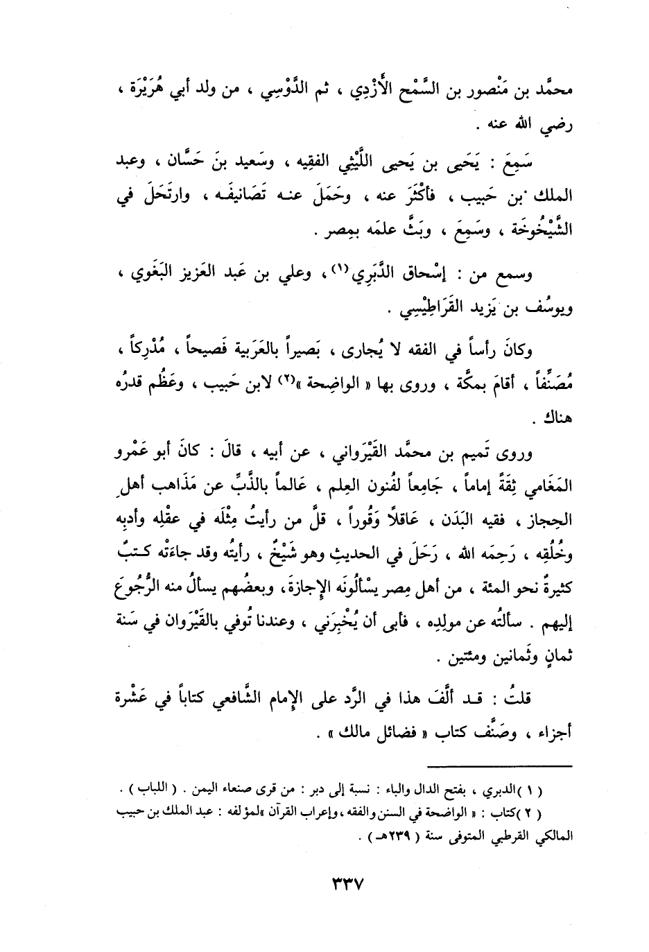 (2) كتاب: " الواضحة في السنن والفقه، وإعراب القرآن " لمؤلفه: عبد الملك بن حبيب المالكي القرطبي المتوفى سنة (239 هـ) .