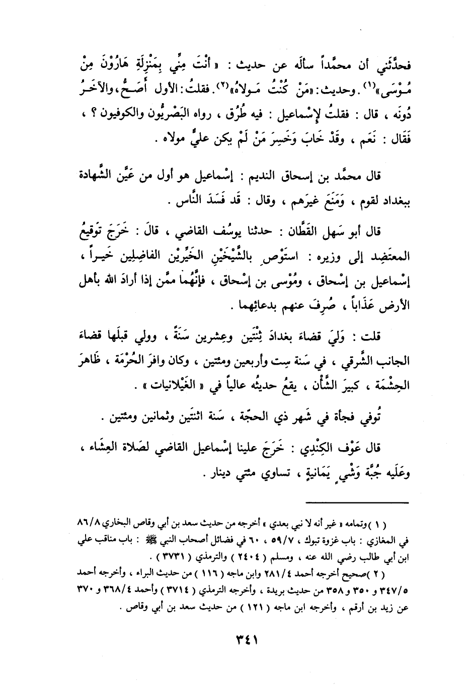 قَالَ مُحَمَّدُ بنُ إِسْحَاقَ النَّدِيْمُ: إِسْمَاعِيْلُ هُوَ أَوَّلُ مَنْ عَيَّنَ الشَّهَادَةَ بِبَغْدَادَ لِقَوْمٍ، وَمَنَعَ غَيْرَهُم، وَقَالَ: قَدْ فَسَدَ النَّاسُ.